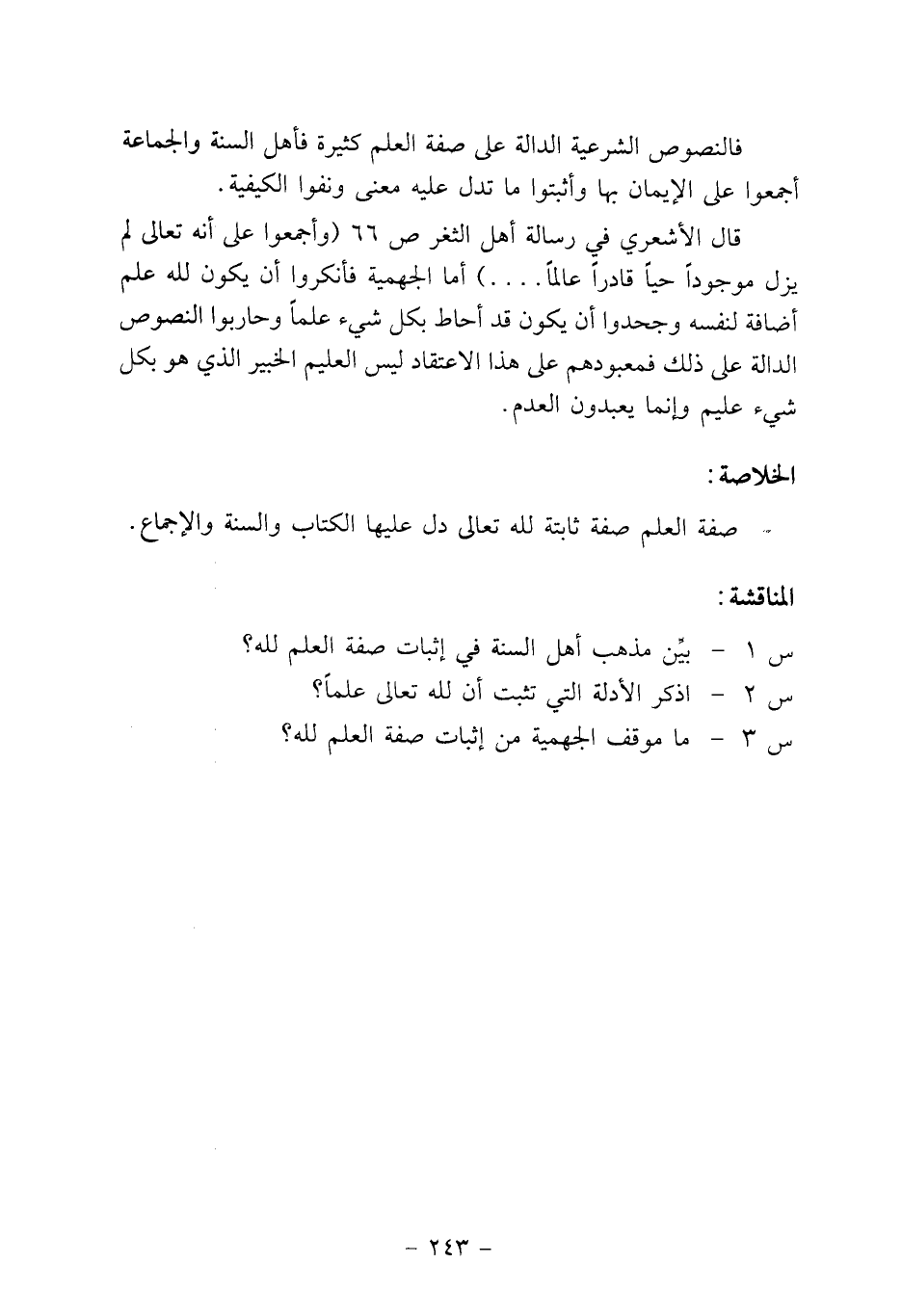 1- صفة العلم صفة ثابتة لله تعالى دل عليها الكتاب والسنة والإجماع.