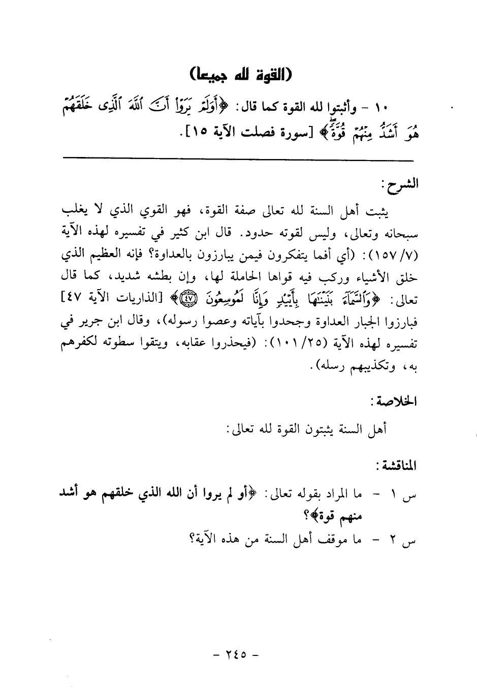 10- وأثبتوا الله القوة كما قال: {أَوَلَمْ يَرَوْا أَنَّ اللَّهَ الَّذِي خَلَقَهُمْ هُوَ أَشَدُّ مِنْهُمْ قُوَّةً} [سورة فصلت الآية 15] .