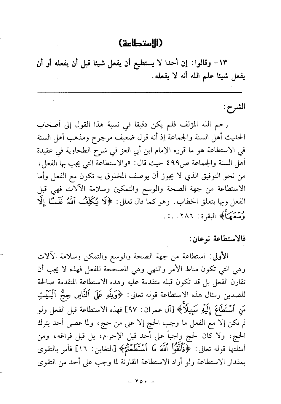 رحم الله المؤلف فلم يكن دقيقاً في نسبة هذا القول إلى أصحاب الحديث أهل السنة والجماعة إذ أنه قول ضعيف مرجوح ومذهب أهل السنة في الاستطاعة هو ما قرره الإمام ابن أبي العز في شرح الطحاوية في عقيدة أهل السنة والجماعة ص 499 حيث قال: "والاستطاعة التي يجب بها الفعل، من نحو التوفيق الذي لا يجوز أن يوصف المخلوق به تكون مع الفعل وأما الاستطاعة من جهة الصحة والوسع والتمكين وسلامة الآلات فهي قبل الفعل وبها يتعلق الخطاب. وهو كما قال تعالى: {لا يُكَلِّفُ اللَّهُ نَفْساً إِلا وُسْعَهَا} البقرة: 286.. ".