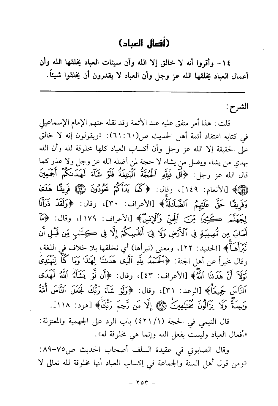 قلت: هذا أمر متفق عليه عند الأئمة وقد نقله عنهم الإمام الإسماعيلي في كتابه اعتقاد أئمة أهل الحديث ص (60: 61) : "ويقولون إنه لا خالق على الحقيقة إلا الله عز وجل وأن أكساب العباد كلها مخلوقة لله وأن الله يهدي من يشاء ويضل من يشاء لا حجة لمن أضله الله عز وجل ولا عذر كما قال الله عز وجل: {قُلْ فَلِلَّهِ الْحُجَّةُ الْبَالِغَةُ فَلَوْ شَاءَ لَهَدَاكُمْ أَجْمَعِينَ} [الأنعام: 149] ، وقال: {كَمَا بَدَأَكُمْ تَعُودُونَ * فَرِيقاً هَدَى وَفَرِيقاً حَقَّ عَلَيْهِمُ الضَّلالَةُ} [الأعراف: 30] ، وقال: {وَلَقَدْ ذَرَأْنَا لِجَهَنَّمَ كَثِيراً مِنَ الْجِنِّ وَالأِنْسِ} [الأعراف: 179] ، وقال: {مَا أَصَابَ مِنْ مُصِيبَةٍ فِي الأَرْضِ وَلا فِي أَنْفُسِكُمْ إِلا فِي كِتَابٍ مِنْ قَبْلِ أَنْ نَبْرَأَهَا} [الحديد: 22] ، ومعنى (نبرأها) أي نخلقها بلا خلاف في اللغة، وقال مخبراً عن أهل الجنة: {الْحَمْدُ لِلَّهِ الَّذِي هَدَانَا لِهَذَا وَمَا كُنَّا لِنَهْتَدِيَ لَوْلا أَنْ هَدَانَا اللَّهُ} [الأعراف: 143] وقال: {أَنْ لَوْ يَشَاءُ اللَّهُ لَهَدَى النَّاسَ جَمِيعاً} [الرعد: 31] وقال: {وَلَوْ شَاءَ رَبُّكَ لَجَعَلَ النَّاسَ أُمَّةً وَاحِدَةً وَلا يَزَالُونَ مُخْتَلِفِينَ *إِلا مَنْ رَحِمَ رَبُّكَ} [هود: 118-119] .