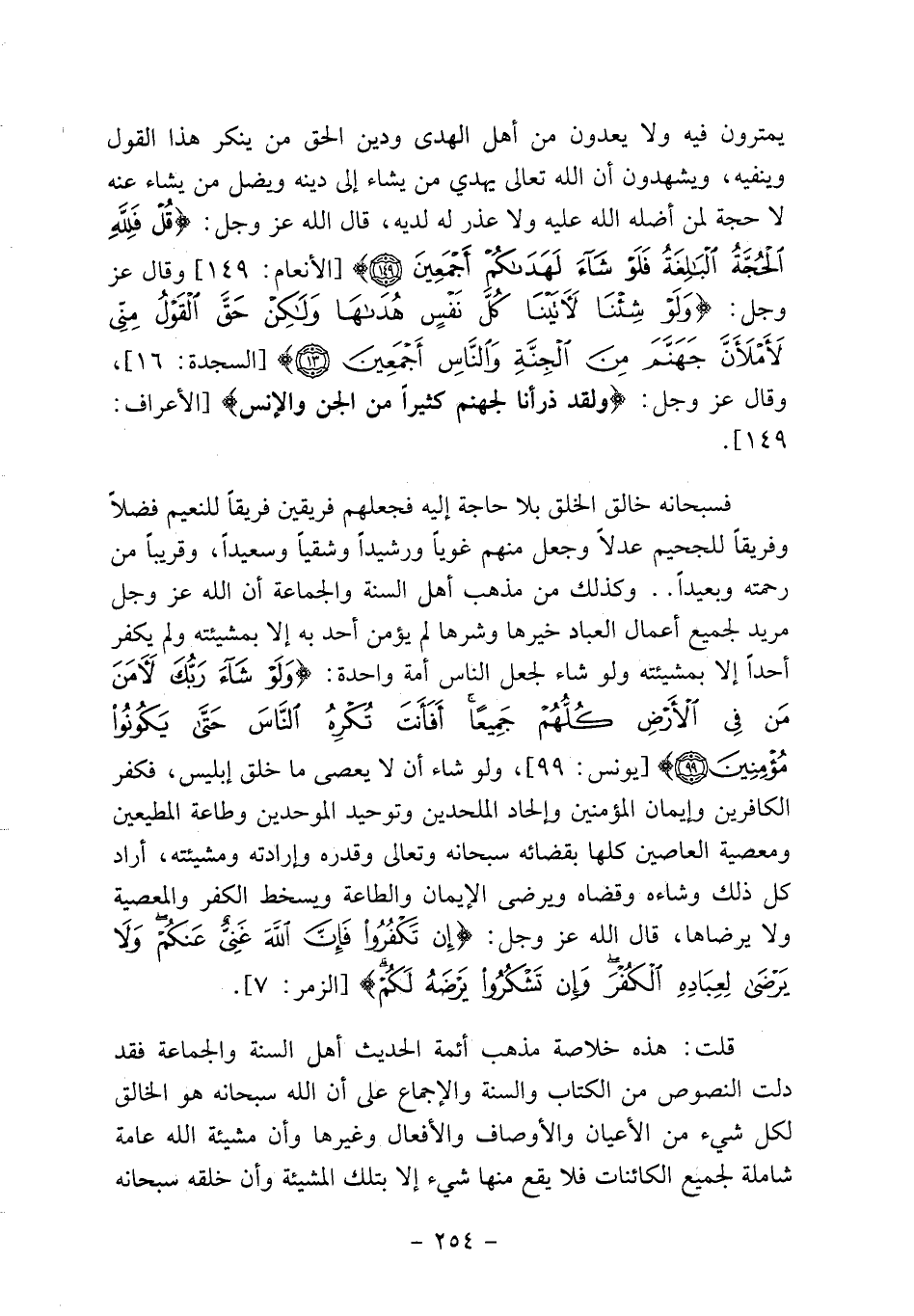 يمترون فيه ولا يعدون من أهل الهدى ودين الحق من ينكر هذا القول وينفيه، ويشهدون أن الله تعالى يهدي من يشاء إلى دينه ويضل من يشاء عنه لا حجة لمن أضله الله عليه ولا عذر له لديه، قال الله عز وجل: {قُلْ فَلِلَّهِ الْحُجَّةُ الْبَالِغَةُ فَلَوْ شَاءَ لَهَدَاكُمْ أَجْمَعِينَ} [الأنعام: 149] وقال عز وجل: {وَلَوْ شِئْنَا لآتَيْنَا كُلَّ نَفْسٍ هُدَاهَا وَلَكِنْ حَقَّ الْقَوْلُ مِنِّي لَأَمْلأَنَّ جَهَنَّمَ مِنَ الْجِنَّةِ وَالنَّاسِ أَجْمَعِينَ} [السجدة: 16] ، وقال عز وجل: {وَلَقَدْ ذَرَأْنَا لِجَهَنَّمَ كَثِيراً مِنَ الْجِنِّ وَالأِنْسِ} [الأعراف: 179] .