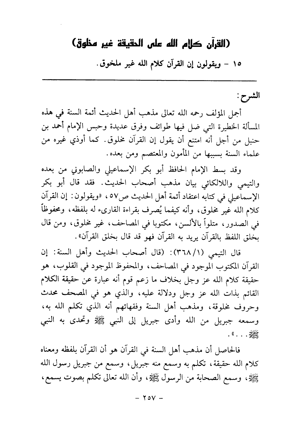 أجمل المؤلف رحمه الله تعالى مذهب أهل الحديث أئمة السنة في هذه المسألة الخطيرة التي ضل فيها طوائف وفرق عديدة وحبس الإمام أحمد بن حنبل من أجل أنه امتنع أن يقول إن القرآن مخلوق. كما أوذي غيره من علماء السنة بسببها من المأمون والمعتصم ومن بعده.