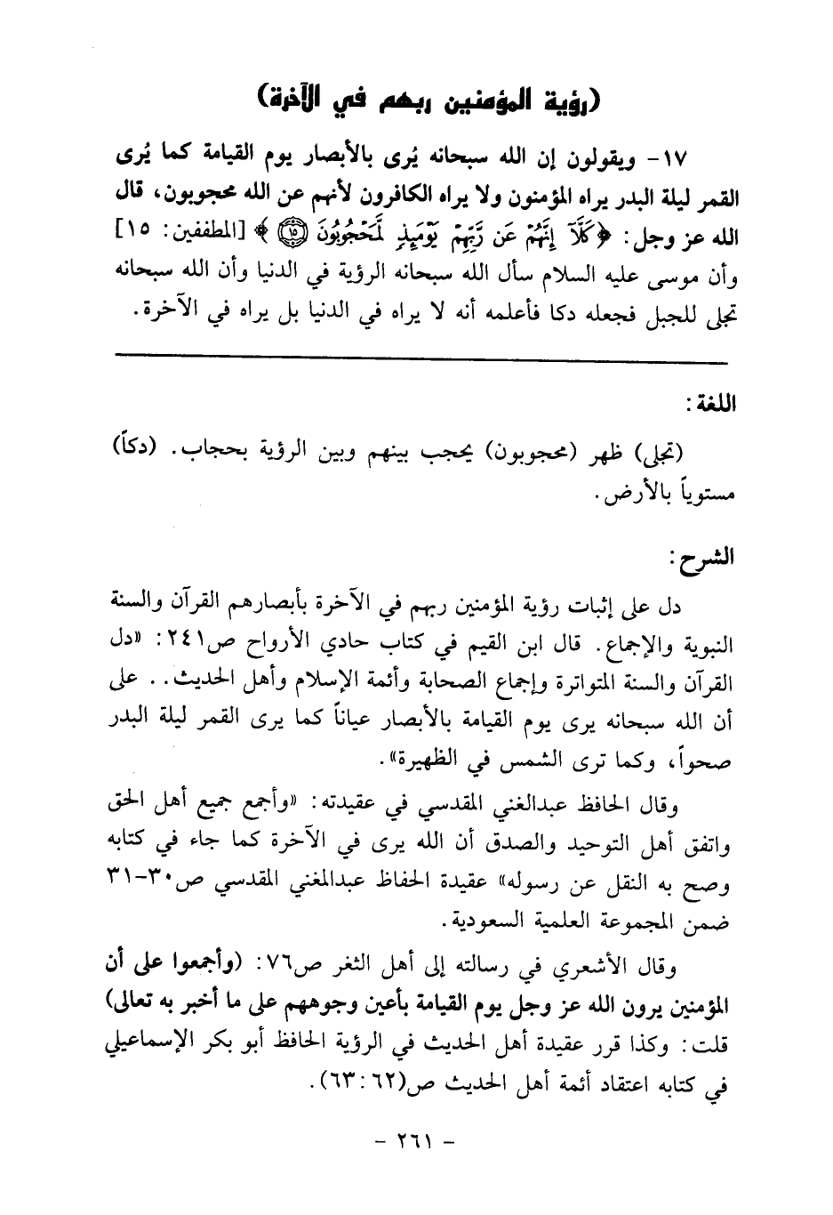 17- ويقولون إن الله سبحانه يرى بالأبصار يوم القيامة كما يرى القمر ليلة البدر يراه المؤمنون ولا يراه الكافرون لأنهم عن الله محجوبون، قال الله عز وجل: {كَلا إِنَّهُمْ عَنْ رَبِّهِمْ يَوْمَئِذٍ لَمَحْجُوبُونَ} [المطففين: 15] وأن موسى عليه السلام سأل الله سبحانه الرؤية في الدنيا وأن الله سبحانه تجلى للجبل فجعله دكاً فأعلمه أنه لا يراه في الدنيا بل يراه في الآخرة.