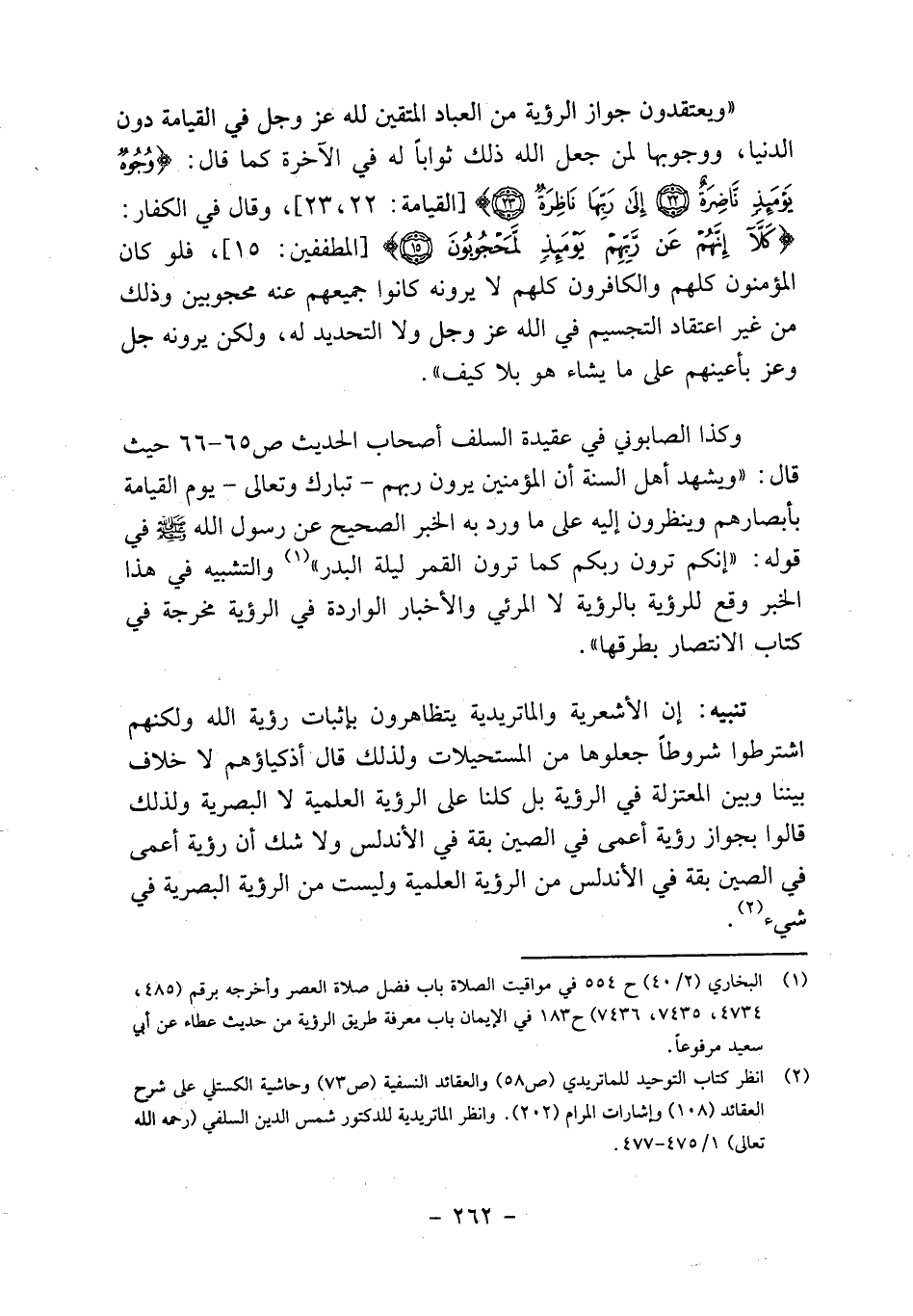 وكذا الصابوني في عقيدة السلف أصحاب الحديث ص65-66 حيث قال: "ويشهد أهل السنة أن المؤمنين يرون ربهم- تبارك وتعالى- يوم القيامة بأبصارهم وينظرون إليه على ما ورد به الخبر الصحيح عن رسول الله صلى الله عليه وسلم في قوله: "إنكم ترون ربكم كما ترون القمر ليلة البدر" 1 والتشبيه في هذا الخبر وقع للرؤية بالرؤية لا المرئي والأخبار الواردة في الرؤية مخرجة في كتاب الانتصار بطرقها".
