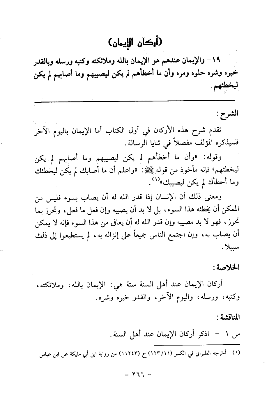 19- والإيمان عندهم هو الإيمان بالله وملائكته وكتبه ورسله وبالقدر خيره وشره حلوه ومره وأن ما أخطأهم لم يكن ليصيبهم وما أصابهم لم يكن ليخطئهم.