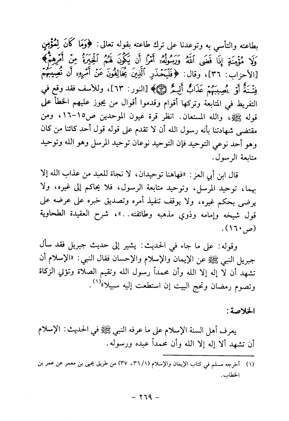 طاعته والتأسي به وتوعدنا على ترك طاعته بقوله تعالى: {وَمَا كَانَ لِمُؤْمِنٍ وَلا مُؤْمِنَةٍ إِذَا قَضَى اللَّهُ وَرَسُولُهُ أَمْراً أَنْ يَكُونَ لَهُمُ الْخِيَرَةُ مِنْ أَمْرِهِمْ} [الأحزاب: 136] وقال: {لا تَجْعَلُوا دُعَاءَ الرَّسُولِ بَيْنَكُمْ كَدُعَاءِ بَعْضِكُمْ بَعْضاً قَدْ يَعْلَمُ اللَّهُ الَّذِينَ يَتَسَلَّلُونَ مِنْكُمْ لِوَاذاً فَلْيَحْذَرِ الَّذِينَ يُخَالِفُونَ عَنْ أَمْرِهِ أَنْ تُصِيبَهُمْ فِتْنَةٌ أَوْ يُصِيبَهُمْ عَذَابٌ أَلِيمٌ} [النور: 63] ، وللأسف فقد وقع في التفريط في المتابعة وتركها أقوام وقدموا أقوال من يجوز عليهم الخطأ على قوله صلى الله عليه وسلم، والله المستعان. انظر قرة عيون الموحدين ص 15-16، ومن مقتضى شهادتنا بأنه رسول الله أن لا تقدم على قوله قول أحد كائناً من كان وهو أحد نوعي التوحيد فإن التوحيد نوعان توحيد المرسل وهو الله وتوحيد متابعة الرسول.