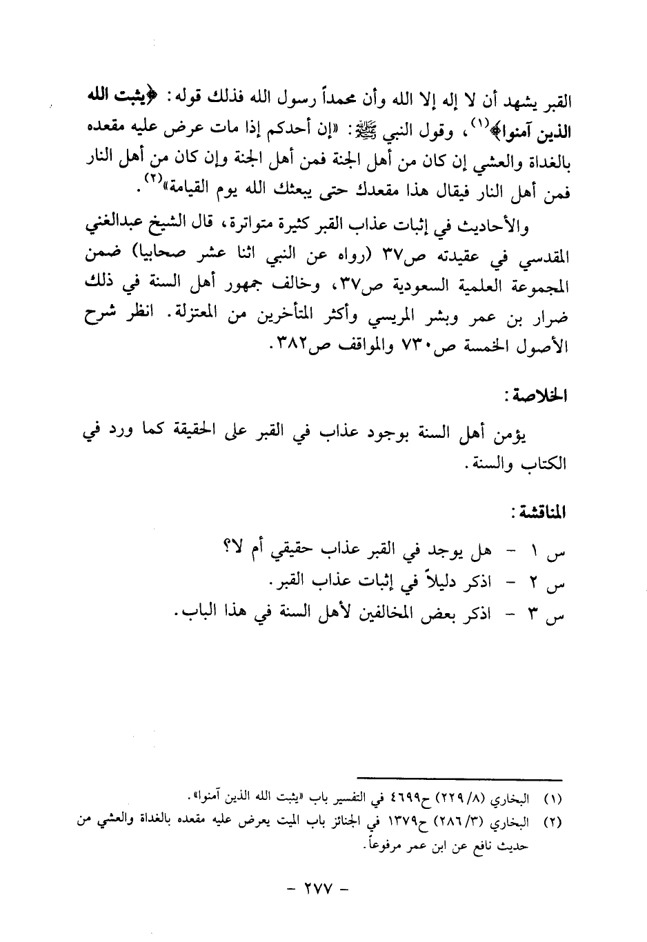 والأحاديث في إثبات عذاب القبر كثيرة متواترة، قال الشيخ عبد الغني المقدسي في عقيدته ص 37 "رواه عن النبي اثنا عشر صحابيا" ضمن المجموعة العلمية السعودية ص 37، وخالف جمهور أهل السنة في ذلك ضرار بن عمر وبشر المريسي وأكثر المتأخرين من المعتزلة. انظر شرح الأصول الخمسة ص 0 73 والمواقف ص 382.