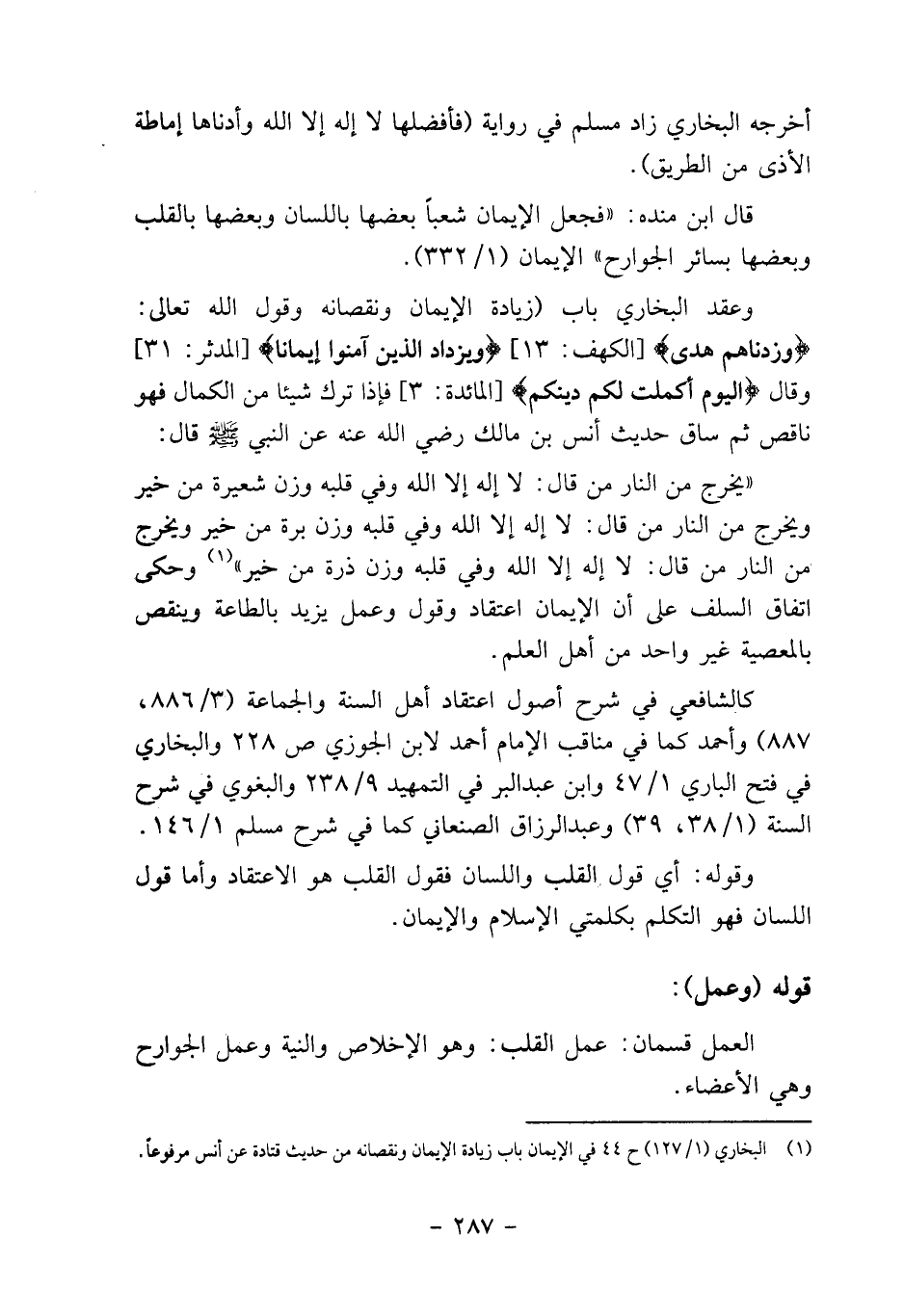 وعقد البخاري باب (زيادة الإيمان ونقصانه وقول الله تعالى: {وَزِدْنَاهُمْ هُدىً} [الكهف:13] {وَيَزْدَادَ الَّذِينَ آمَنُوا إِيمَاناً} [المدثر:31] وقال: {الْيَوْمَ أَكْمَلْتُ لَكُمْ دِينَكُمْ} [المائدة: 3] فإذا ترك شيئاً من الكمال فهو ناقص ثم ساق حديث أنس بن مالك رضي الله عنه عن النبي صلى الله عليه وسلم قال: "يخرج من النار من قال: لا إله إلا الله وفي قلبه وزن شعيرة من خير ويخرج من النار من قال: لا إله إلا الله وفي قلبه وزن برة من خير ويخرج من النار من قال: لا إله إلا الله وفي قلبه وزن ذرة من خير" 1 وحكى اتفاق السلف على أن الإيمان اعتقاد وقول وعمل يزيد بالطاعة وينقص بالمعصية غير واحد من أهل العلم.