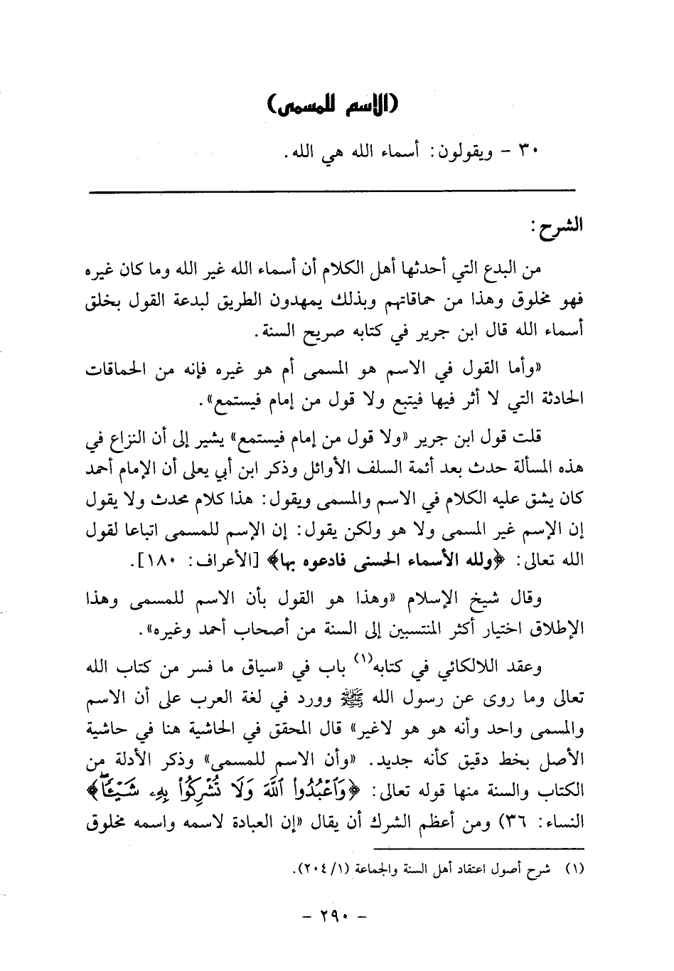 وعقد اللالكائي في كتابه1 باب في "سياق ما فسر من كتاب الله تعالى وما روى عن رسول الله صلى الله عليه وسلم وورد في لغة العرب على أن الاسم والمسمى وأحد وأنه هو هو لا غير" قال المحقق في الحاشية هنا في حاشية الأصل بخط دقيق كأنه جديد. "وأن الاسم للمسمى"وذكر الأدلة من الكتاب والسنة منها قوله تعالى: {وَاعْبُدُوا اللَّهَ وَلا تُشْرِكُوا بِهِ شَيْئاً} [النساء: 36] ومن أعظم الشرك أن يقال "إن العبادة لاسمه واسمه مخلوق