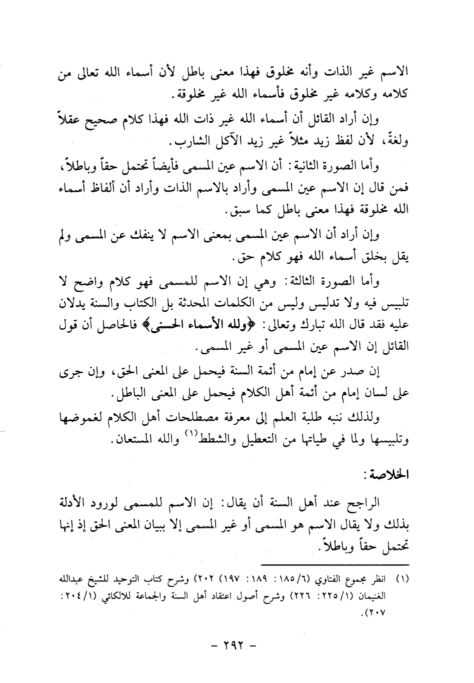 وأما الصورة الثانية: أن الاسم عين المسمى فأيضاً تحتمل حقاً وباطلاً، فمن قال إن الاسم عين المسمى وأراد بالاسم الذات وأراد أن ألفاظ أسماء الله مخلوقة فهذا معنى باطل كما سبق.