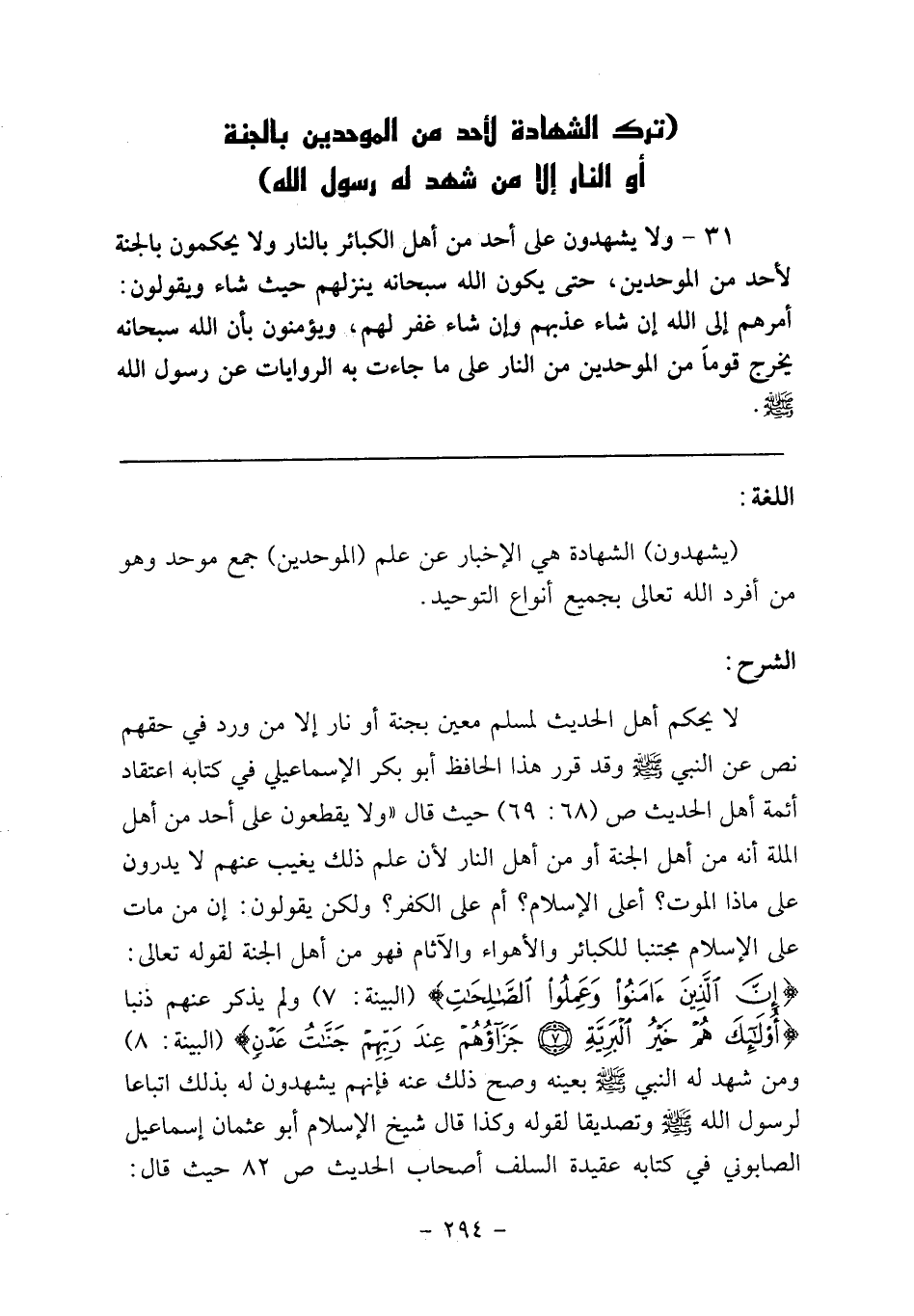 31- ولا يشهدون على أحد من أهل الكبائر بالنار ولا يحكمون بالجنة لأحد من الموحدين، حتى يكون الله سبحانه ينزلهم حيث شاء ويقولون: أمرهم إلى الله إن شاء عذبهم وإن شاء غفر لهم، ويؤمنون بأن الله سبحانه يخرج قوماً من الموحدين من النار على ما جاءت به الروايات عن رسول الله صلى الله عليه وسلم.