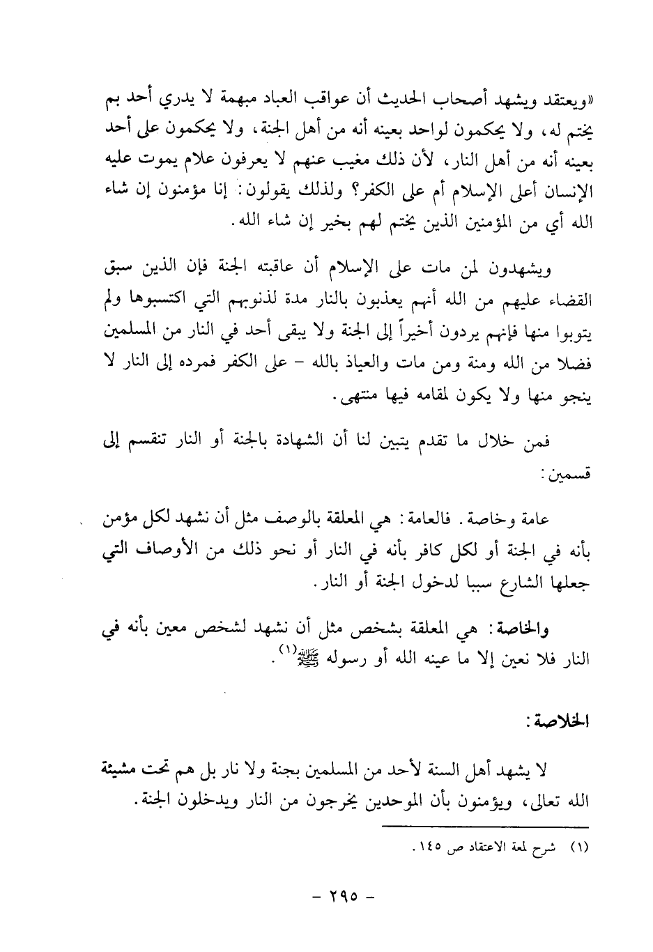 "ويعتقد ويشهد أصحاب الحديث أن عواقب العباد مبهمة لا يدري أحد بم يختم له، ولا يحكمون لواحد بعينه أنه من أهل الجنة، ولا يحكمون على أحد بعينه أنه من أهل النار، لأن ذلك مغيب عنهم لا يعرفون علام يموت عليه الإنسان أعلى الإسلام أم على الكفر؟ ولذلك يقولون: إنا مؤمنون إن شاء الله أي من المؤمنين الذين يختم لهم بخير إن شاء الله.