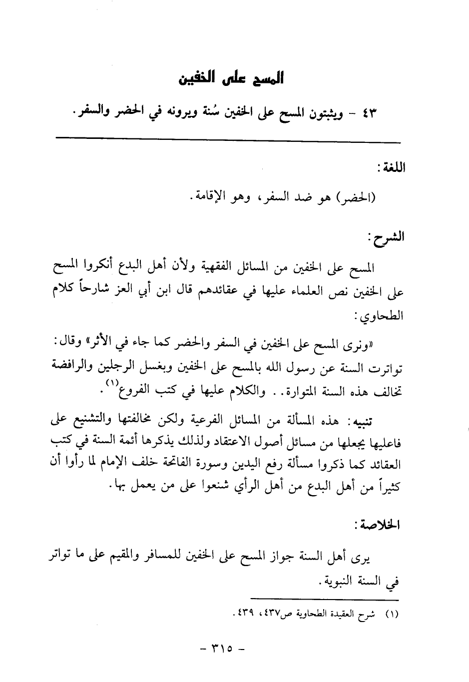 43 - ويثبتون المسح على الخفين سُنة ويرونه في الحضر والسفر.