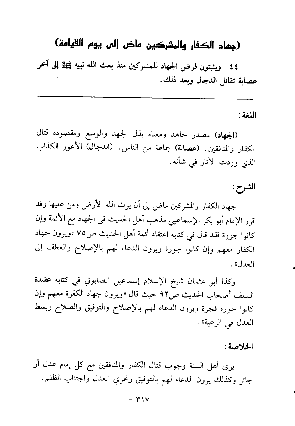 44 - ويثبتون فرض الجهاد للمشركين منذ بعث الله نبيه صلى الله عليه وسلم إلى آخر عصابة تقاتل الدجال وبعد ذلك.