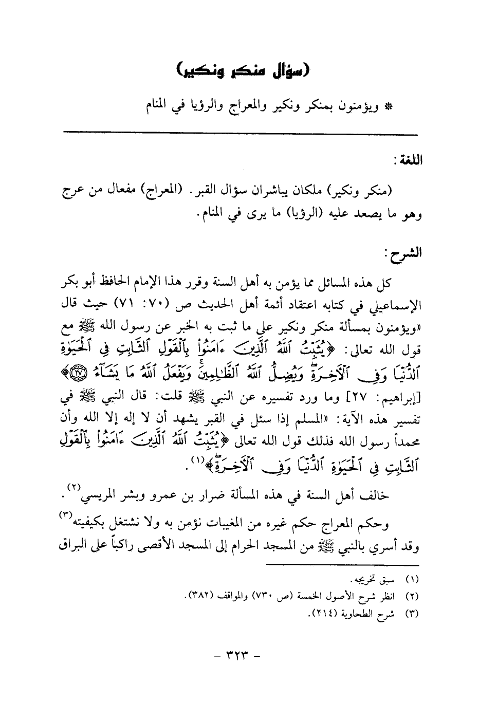 (منكر ونكير) ملكان يباشران سؤال القبر. (المعراج) مفعال من عرج وهو ما يصعد عليه (الرؤيا) ما يرى في المنام.