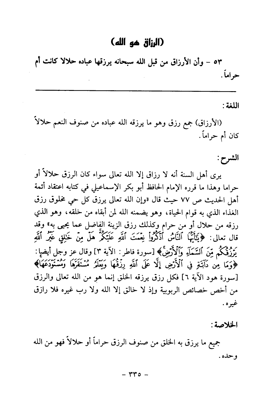 53- وأن الأرزاق من قبل الله سبحانه يرزقها عباده حلالاً كانت أم حراماً.