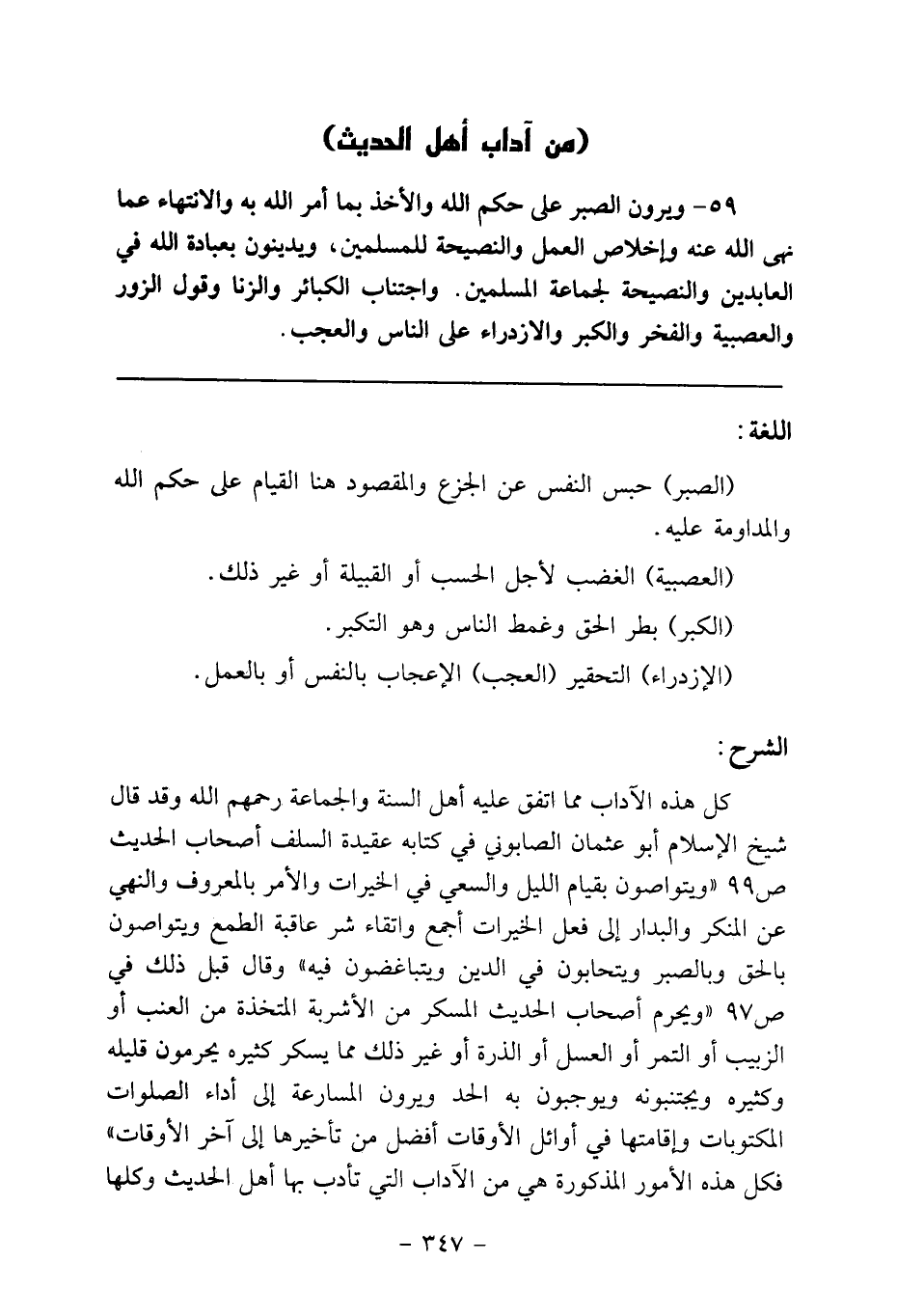59- ويرون الصبر على حكم الله والأخذ بما أمر الله به والانتهاء عما نهى الله عنه وإخلاص العمل والنصيحة للمسلمين، ويدينون بعبادة الله في العابدين والنصيحة لجماعة المسلمين. واجتناب الكبائر والزنا وقول الزور والعصبية والفخر والكبر والازدراء على الناس والعجب.
