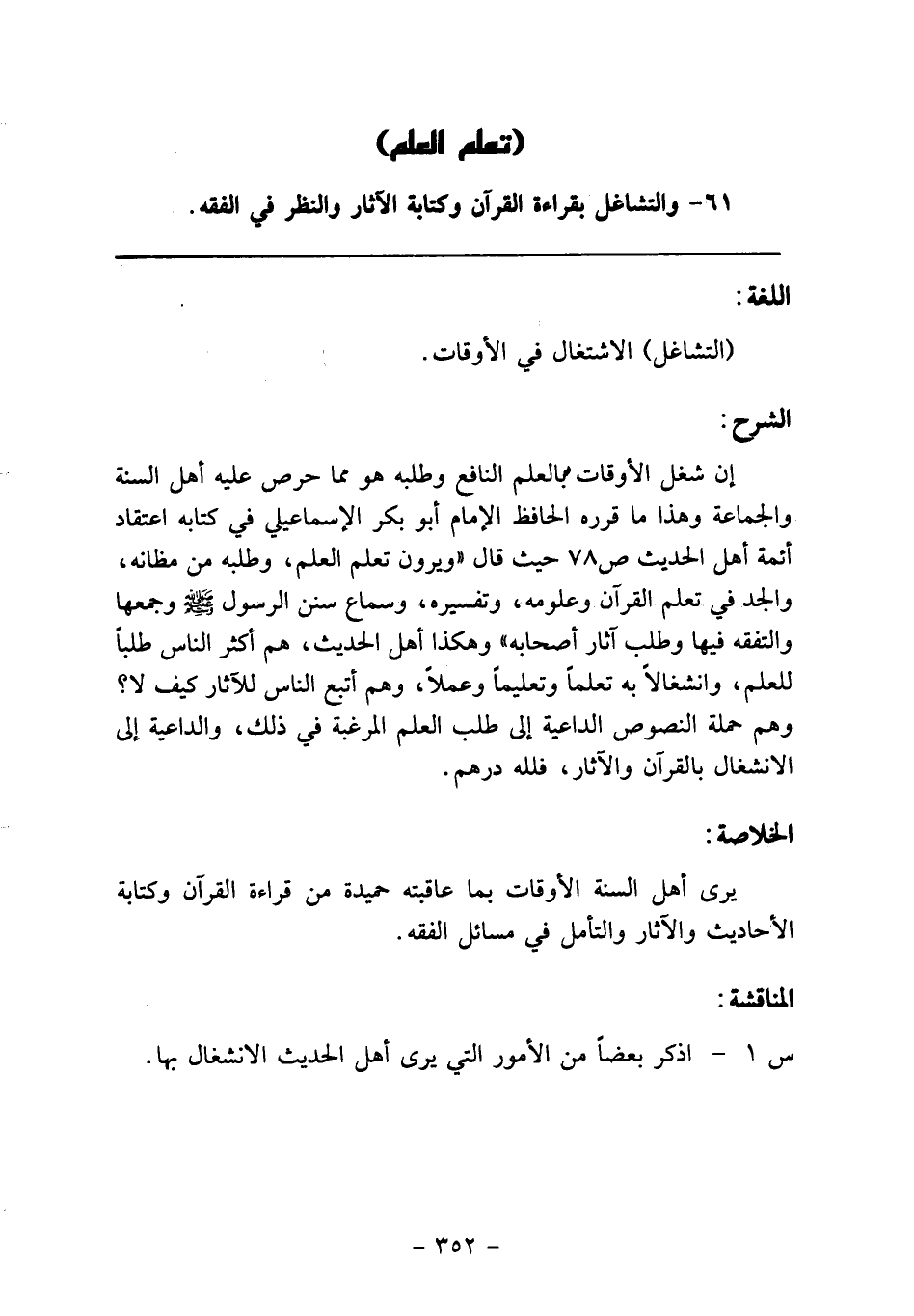 إن شغل الأوقات بالعلم النافع وطلبه هو مما حرص عليه أهل السنة والجماعة وهذا ما قرره الحافظ الإمام أبو بكر الإسماعيلي في كتابه اعتقاد أئمة أهل الحديث ص 78 حيث قال "ويرون تعلم العلم، وطلبه من مظانه، والجد في تعلم القرآن وعلومه، وتفسيره، وسماع سنن الرسول صلى الله عليه وسلم وجمعها والتفقه فيها وطلب آثار أصحابه" وهكذا أهل الحديث، هم أكثر الناس طلباً للعلم، وانشغالاً به تعلماً وتعليماً وعملاً، وهم أتبع الناس للآثار كيف لا؟ وهم حملة النصوص الداعية إلى طلب العلم المرغبة في ذلك، والداعية إلى الانشغال بالقرآن والآثار، فلله درهم.