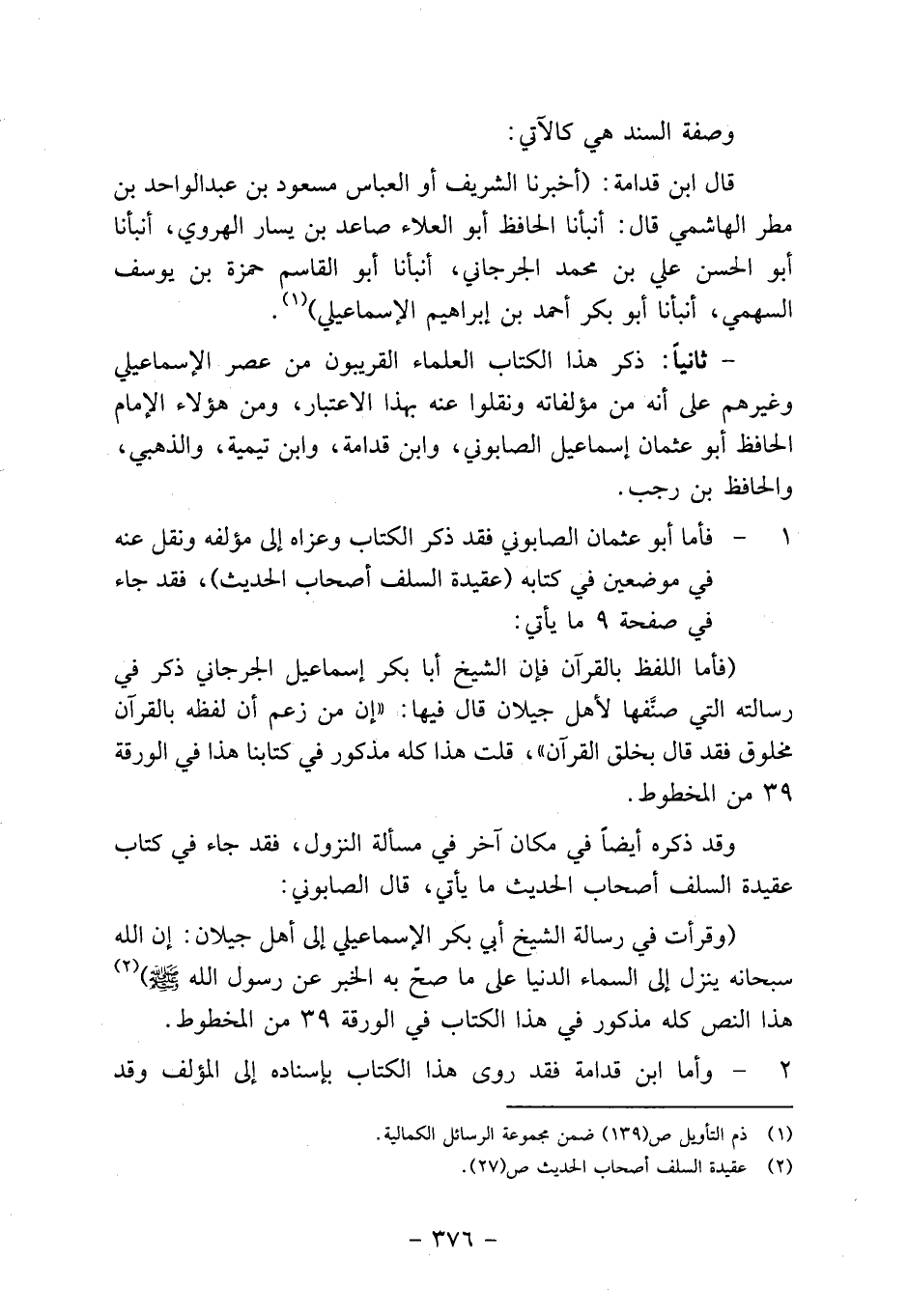 "وقرأت في رسالة الشيخ أبي بكر الإسماعيلي إلى أهل جيلان: إن الله سبحانه ينزل إلى السماء الدنيا على ما صح به الخبر عن رسول الله صلى الله عليه وسلم"2 هذا النص كله مذكور في هذا الكتاب في الورقة 39 من المخطوط.
