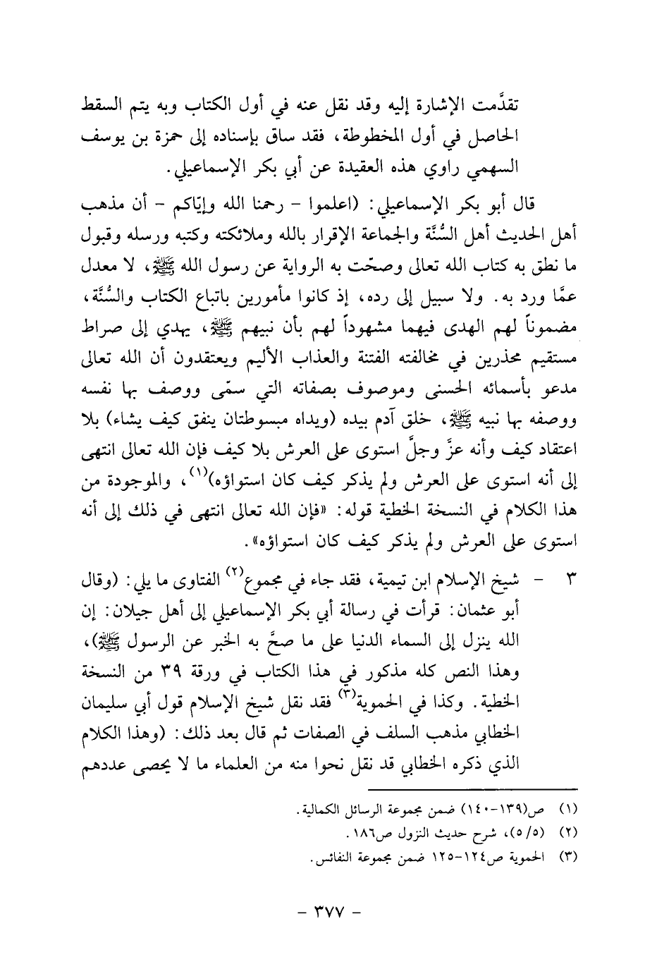 3- شيخ الإسلام ابن تيمية، فقد جاء في مجموع2 الفتاوى ما يلي: "وقال أبو عثمان: قرأت في رسالة أبي بكر الإسماعيلي إلى أهل جيلان: إن الله ينزل إلى السماء الدنيا على ما صح به الخبر عن الرسول صلى الله عليه وسلم"، وهذا النص كله مذكور في هذا الكتاب في ورقة 39 من النسخة الخطية. وكذا في الحموية3 فقد نقل شيخ الإسلام قول أبي سليمان الخطابي مذهب السلف في الصفات ثم قال بعد ذلك: "وهذا الكلام الذي ذكره الخطاب قد نقل نحوا منه من العلماء ما لا يحصى عددهم
