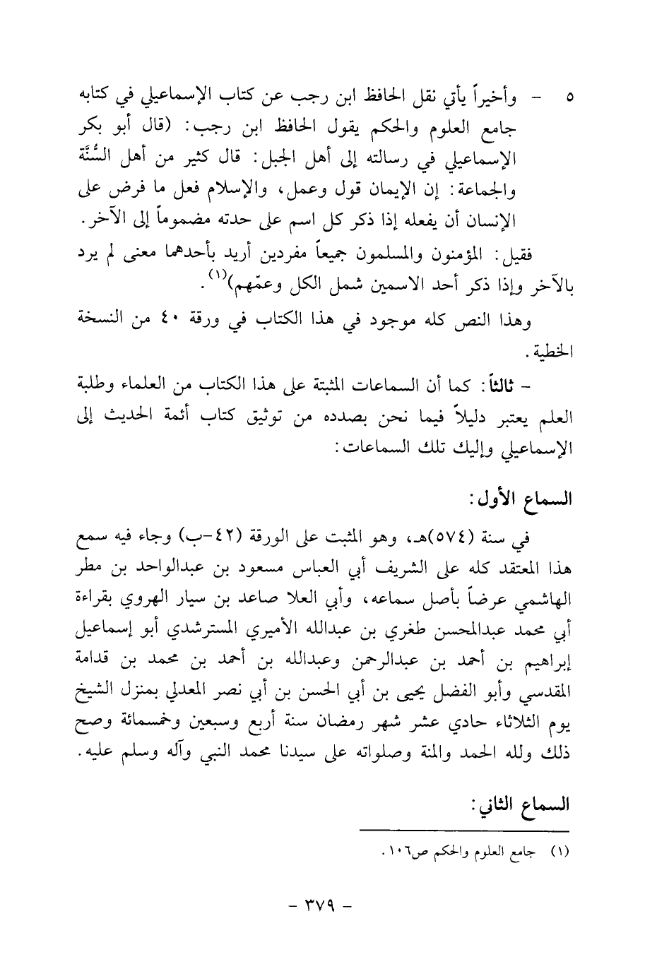5- وأخيراً يأتي نقل الحافظ ابن رجب عن كتاب الإسماعيلي في كتابه جامع العلوم والحكم يقول الحافظ ابن رجب: "قال أبو بكر الإسماعيلي في رسالته إلى أهل الجبل: قال كثير من أهل السنة والجماعة: إن الإيمان قول وعمل، والإسلام فعل ما فرض على الإنسان أن يفعله إذا ذكر كل اسم على حدته مضموماً إلى الآخر.