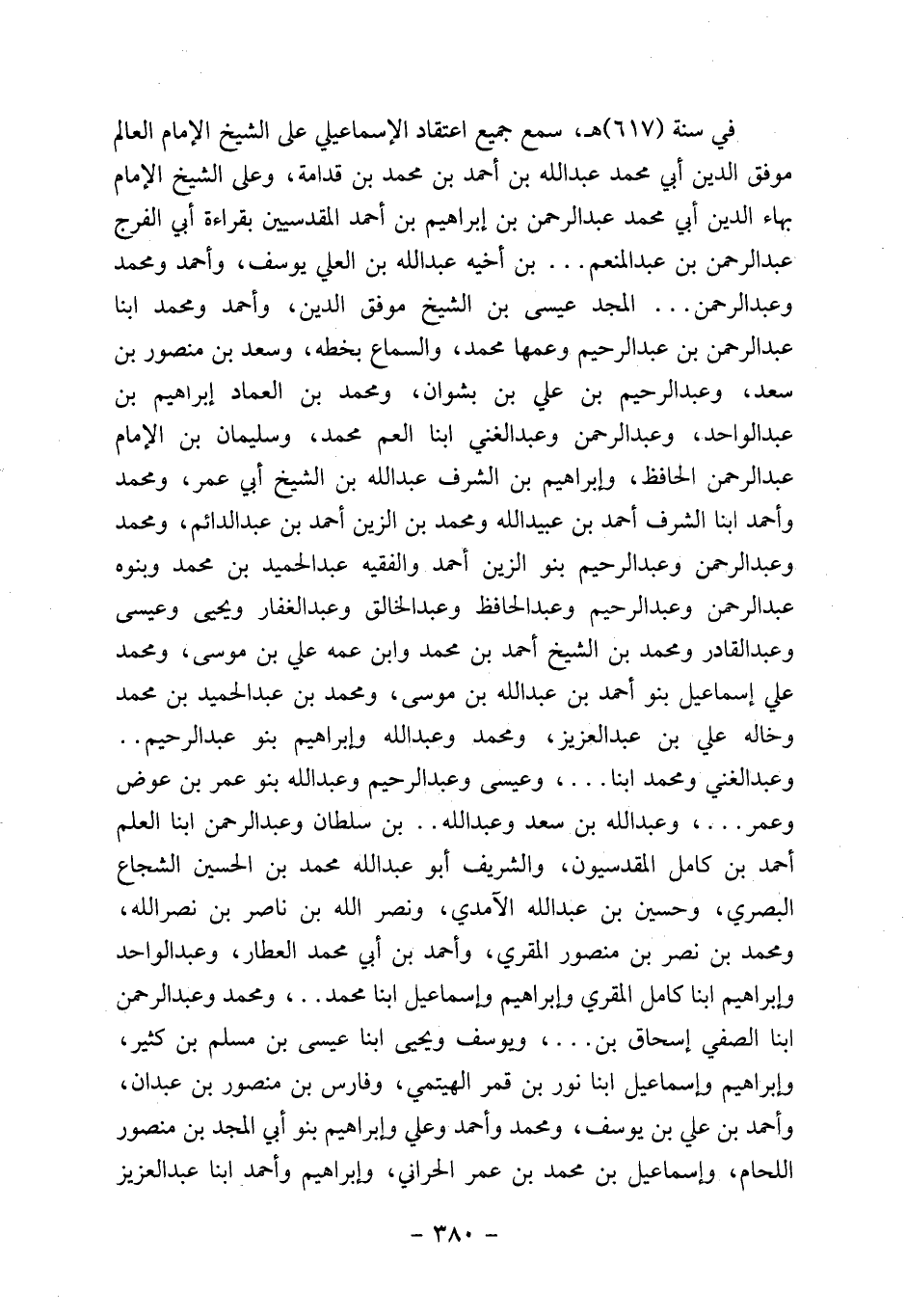 في سنة (617) هـ، سمع جميع اعتقاد الإسماعيلي على الشيخ الإمام العالم موفق الدين أبي محمد عبد الله بن أحمد بن محمد بن قدامة، وعلى الشيخ الإمام بهاء الدين أبي محمد عبد الرحمن بن إبراهيم بن أحمد المقدسيين بقراءة أبي الفرج عبد الرحمن بن عبد المنعم ... بن أخيه عبد الله بن العلي يوسف، وأحمد ومحمد وعبد الرحمن ... المجد عيسى بن الشيخ موفق الدين، وأحمد ومحمد ابنا عبد الرحمن بن عبد الرحيم وعمها محمد، والسماع بخطه، وسعد بن منصور بن سعد، وعبد الرحيم بن علي بن بشوان، ومحمد بن العماد إبراهيم بن عبد الواحد، وعبد الرحمن وعبد الغني ابنا العم محمد، وسليمان بن الإمام عبد الرحمن الحافظ، وإبراهيم بن الشرف عبد الله بن الشيخ أبي عمر، ومحمد وأحمد ابنا الشرف أحمد بن عبيد الله ومحمد بن الزين أحمد بن عبد الدائم، ومحمد وعبد الرحمن وعبد الرحيم بنو الزين أحمد والفقيه عبد الحميد بن محمد وبنوه عبد الرحمن وعبد الرحيم وعبد الحافظ وعبد الخالق وعبد الغافار ويحيى وعيسى وعبد القادر ومحمد بن الشيخ أحمد بن محمد وابن عمه علي بن موسى، ومحمد علي إسماعيل بنو أحمد بن عبد الله بن موسى، ومحمد بن عبد الحميد بن محمد وخاله علي بن عبد العزيز، ومحمد وعبد الله وإبراهيم بنو عبد الرحيم.. وعبد الغني ومحمد ابنا ... ، وعيسى وعبد الرحيم وعبد الله بنو عمر بن عوض وعمر ... ، وعبد الله بن سعد وعبد الله.. بن سلطان وعبد الرحمن ابنا العلم أحمد بن كامل المقدسيون، والشريف أبو عبد الله محمد بن الحسين الشجاع البصري، وحسين بن عبد الله الآمدي، ونصر الله بن ناصر بن نصرالله، ومحمد بن نصر بن منصور المقري، وأحمد بن أبي محمد العطار، وعبد الواحد وإبراهيم ابنا كامل المقري وإبراهيم وإسماعيل ابنا محمد..، ومحمد وعبد الرحمن ابنا الصفي إسحاق بن ... ، ويوسف ويحيى ابنا عيسى بن مسلم بن كثير، وإبراهيم وإسماعيل ابنا نور بن قمر الهيتمي، وفارس بن منصور بن عبدان، وأحمد بن علي بن يوسف، ومحمد وأحمد وعلي وإبراهيم بنو أبي المجد بن منصور اللحام، وإسماعيل بن محمد بن عمر الحراني، وإبراهيم وأحمد ابنا عبد العزيز