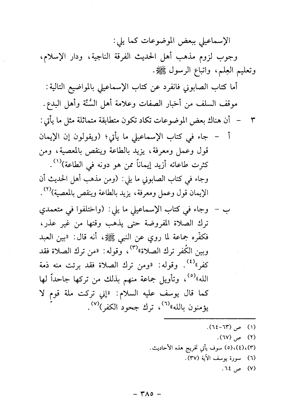 أما كتاب الصابوني فانفرد عن كتاب الإسماعيلي بالمواضيع التالية: