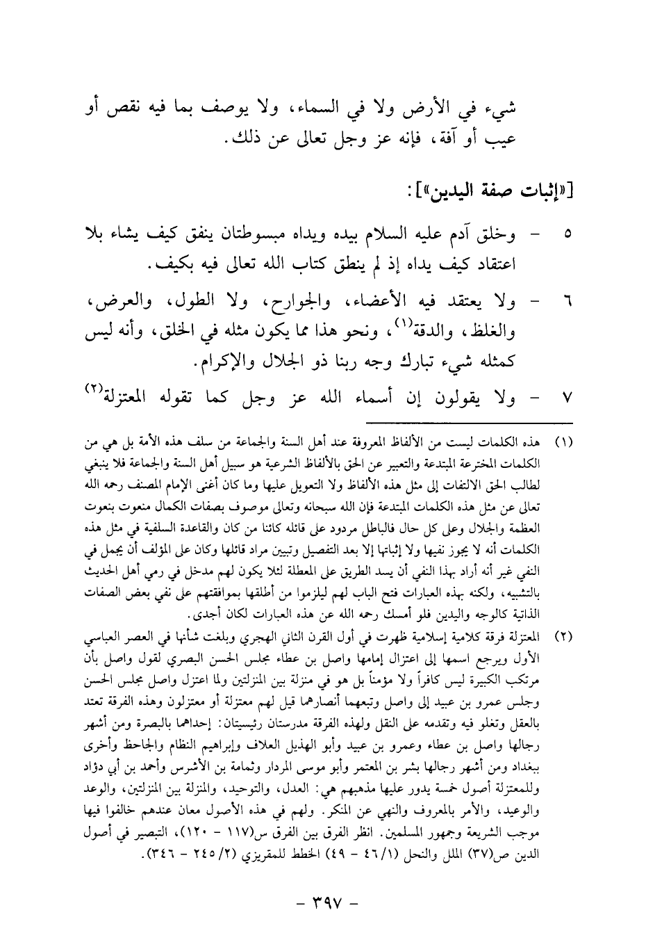 5- وخلق آدم عليه السلام بيده ويداه مبسوطتان ينفق كيف يشاء بلا اعتقاد كيف يداه إذ لم ينطق كتاب الله تعالى فيه بكيف.