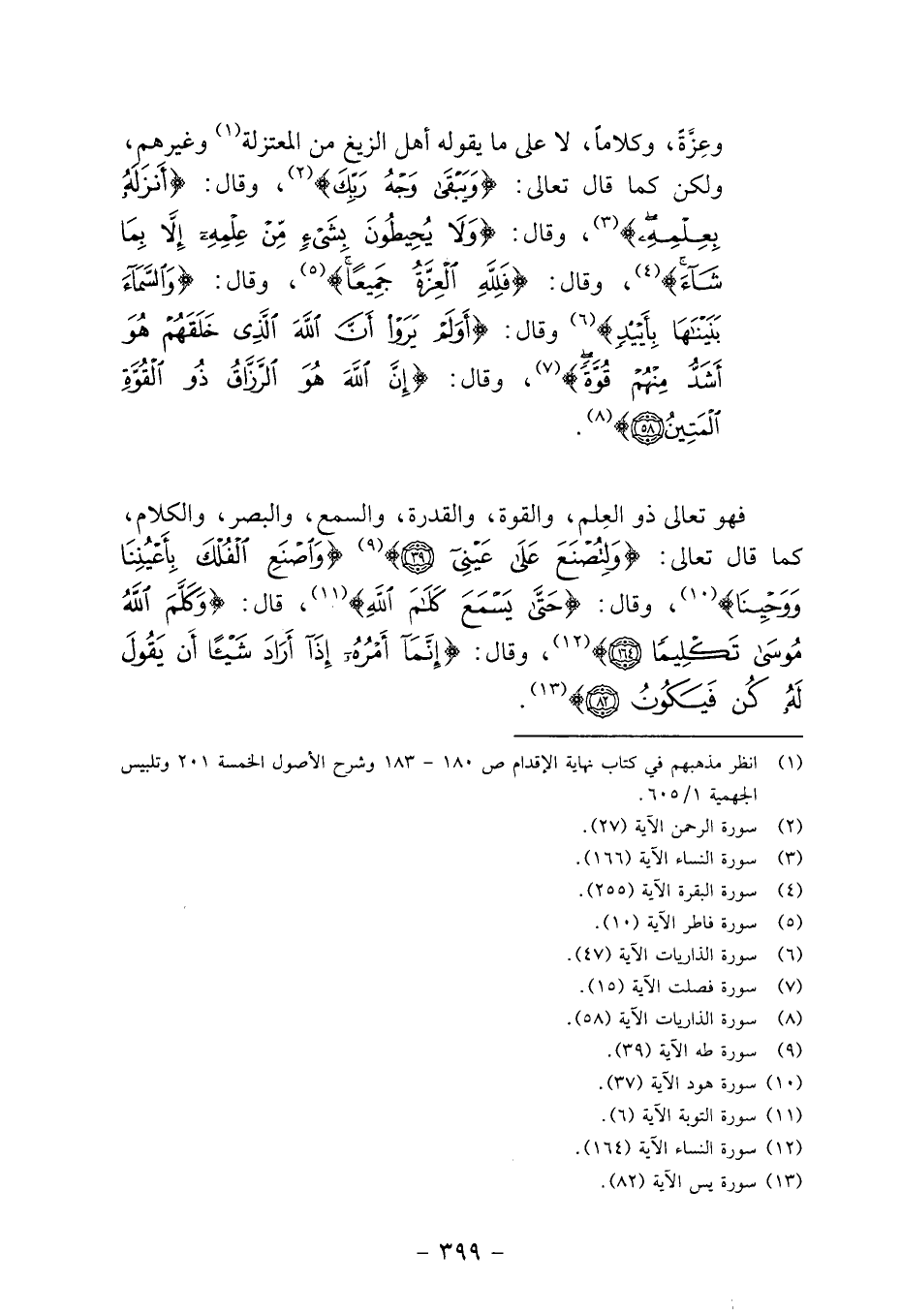 وعِزَّة، وكلاماً، لا على ما يقوله أهل الزيغ من المعتزلة1 وغيرها، ولكن كما قال تعالى: {وَيَبْقَى وَجْهُ رَبِّكَ} 2، وقال: {أَنْزَلَهُ بِعِلْمِهِ} 3، وقال: {وَلا يُحِيطُونَ بِشَيْءٍ مِنْ عِلْمِهِ إِلا بِمَا شَاءَ} 4، وقال: {فَلِلَّهِ الْعِزَّةُ جَمِيعاً} 5، وقال: {وَالسَّمَاءَ بَنَيْنَاهَا بِأَيْدٍ} 6 وقال: {أَوَلَمْ يَرَوْا أَنَّ اللَّهَ الَّذِي خَلَقَهُمْ هُوَ أَشَدُّ مِنْهُمْ قُوَّةً} 7، وقال {إِنَّ اللَّهَ هُوَ الرَّزَّاقُ ذُو الْقُوَّةِ الْمَتِينُ} 8.
