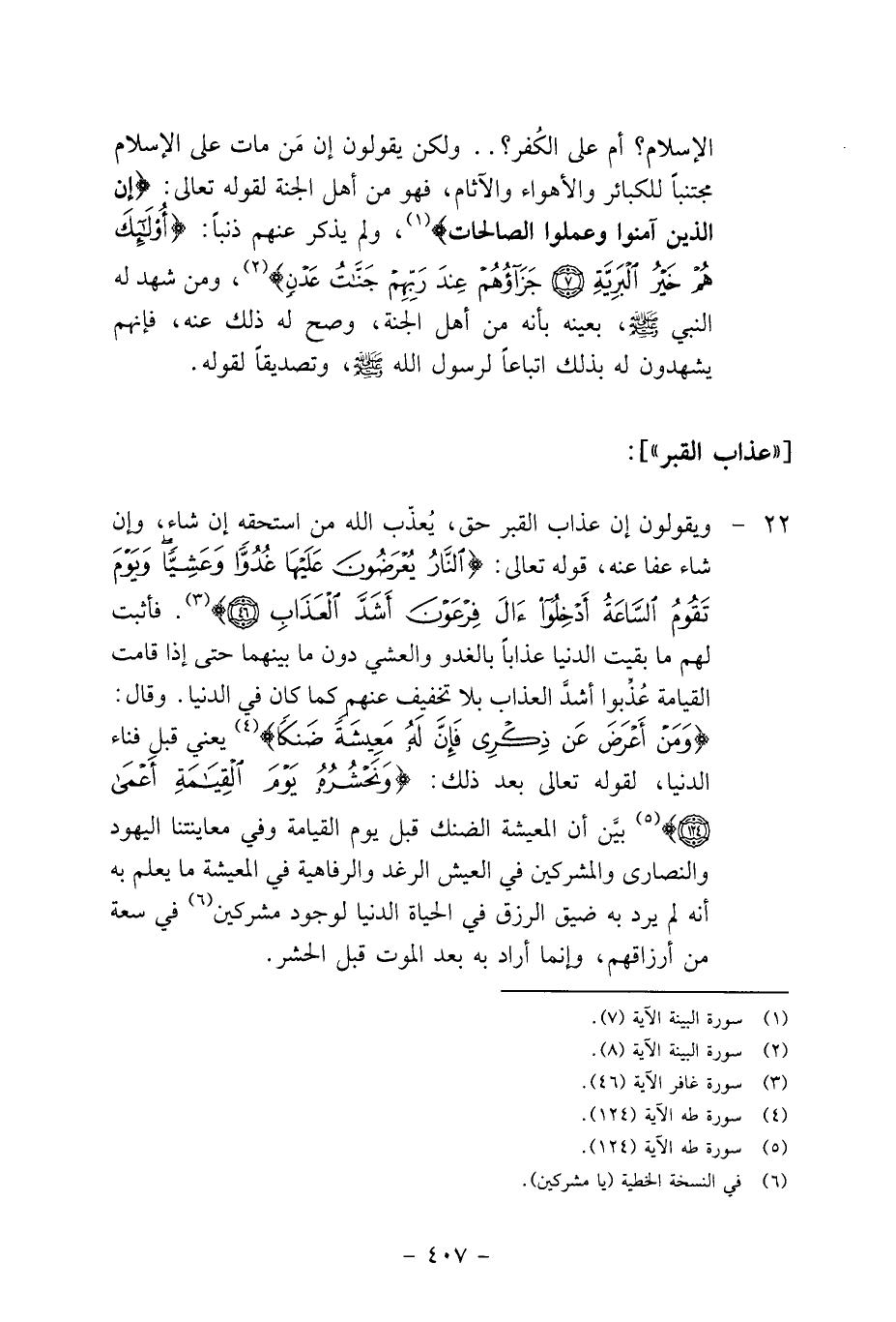 22- ويقولون إن عذاب القبر حق، يعذب الله من استحقه إن شاء وإن شاء عفا عنه، قوله تعالى: {النَّارُ يُعْرَضُونَ عَلَيْهَا غُدُوّاً وَعَشِيّاً وَيَوْمَ تَقُومُ السَّاعَةُ أَدْخِلُوا آلَ فِرْعَوْنَ أَشَدَّ الْعَذَابِ} 3. فأثبت لهم ما بقيت الدنيا عذاباً بالغدو والعشي دون ما بينهما حتى إذا قامت القيامة عذبوا أشدَّ العذاب بلا تخفيف عنهم كما كان في الدنيا. وقال: {وَمَنْ أَعْرَضَ عَنْ ذِكْرِي فَإِنَّ لَهُ مَعِيشَةً ضَنْكاً} 4 يعني قبل فناء الدنيا، لقوله تعالى بعد ذلك: {وَنَحْشُرُهُ يَوْمَ الْقِيَامَةِ أَعْمَى} 5 بيَّن أن المعيشة الضنك قبل يوم القيامة وفي معاينتنا اليهود والنصارى والمشركين في العيش الرغد والرفاهية في المعيشة ما يعلم به أنه لم يرد به ضيق الرزق في الحياة الدنيا لوجود مشركين6 في سعة من أرزاقهم، وإنما أراد به بعد الموت قبل الحشر.