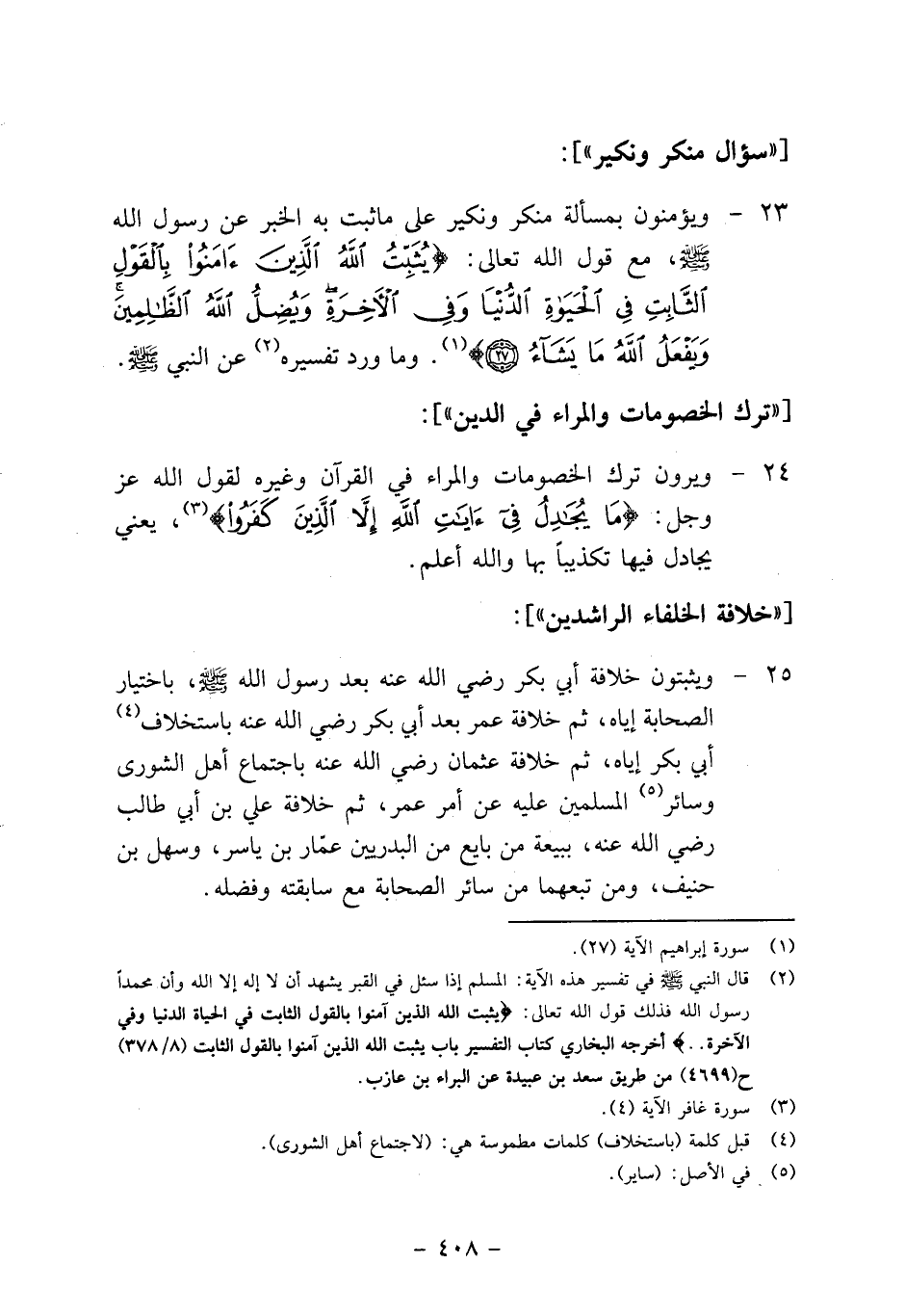 23- ويؤمنون بمسألة منكر ونكير على ما ثبت به الخبر عن رسول الله صلى الله عليه وسلم، مع قول الله تعالى: {يُثَبِّتُ اللَّهُ الَّذِينَ آمَنُوا بِالْقَوْلِ الثَّابِتِ فِي الْحَيَاةِ الدُّنْيَا وَفِي الآخِرَةِ وَيُضِلُّ اللَّهُ الظَّالِمِينَ وَيَفْعَلُ اللَّهُ مَا يَشَاءُ} 1. وما ورد تفسيره2 عن النبي صلى الله عليه وسلم.