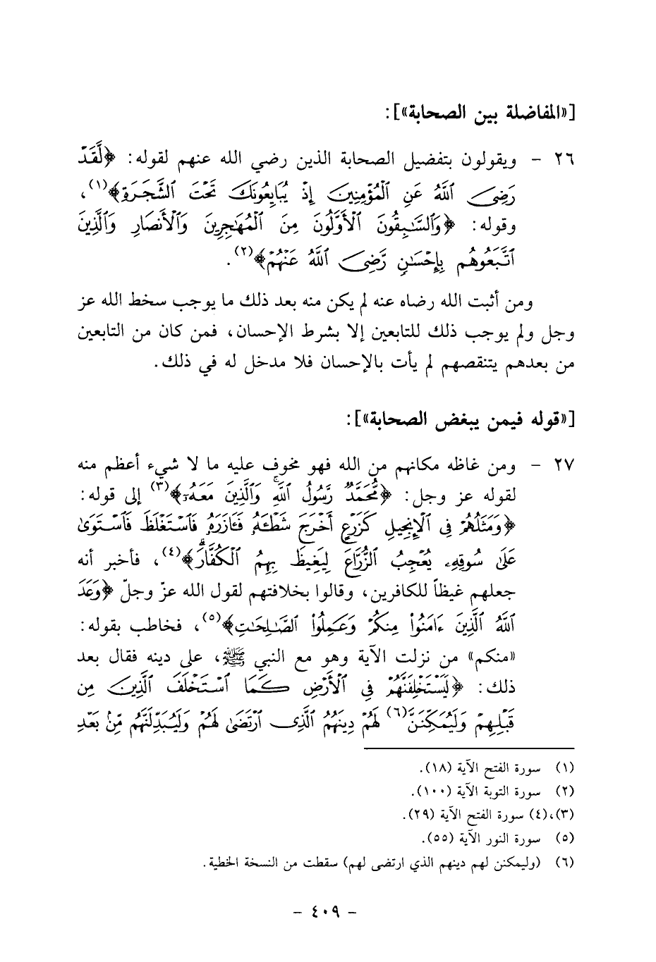 26 - ويقولون بتفضيل الصحابة الذين رضي الله عنهم وقوله: {لَقَدْ رَضِيَ اللَّهُ عَنِ الْمُؤْمِنِينَ إِذْ يُبَايِعُونَكَ تَحْتَ الشَّجَرَةِ} 1، وقوله: {وَالسَّابِقُونَ الْأَوَّلُونَ مِنَ الْمُهَاجِرِينَ وَالْأَنْصَارِ وَالَّذِينَ اتَّبَعُوهُمْ بِإِحْسَانٍ رَضِيَ اللَّهُ عَنْهُمْ} 2.