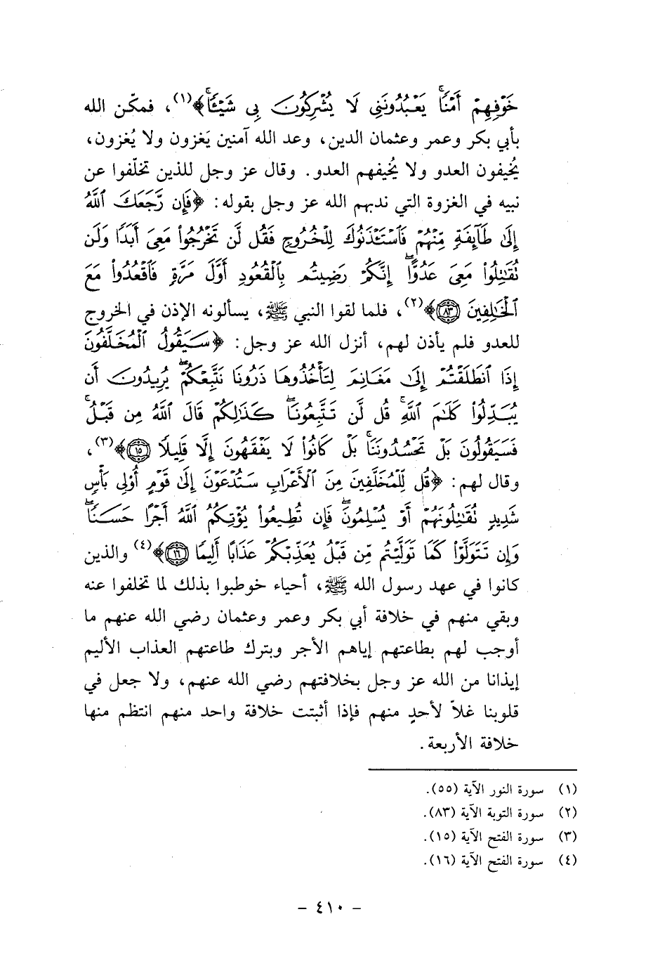 خَوْفِهِمْ أَمْناً يَعْبُدُونَنِي لا يُشْرِكُونَ بِي شَيْئاً} 1، فمكّن الله بأبي بكر وعمر وعثمان الدين، وعد الله آمنين يَغزون ولا يُغزون، يُخيفون العدو ولا يُخيفهم العدو. وقال عز وجل للذين تخلّفوا عن نبيه في الغزوة التي ندبهم الله عز وجل بقوله: {فَإِنْ رَجَعَكَ اللَّهُ إِلَى طَائِفَةٍ مِنْهُمْ فَاسْتَأْذَنُوكَ لِلْخُرُوجِ فَقُلْ لَنْ تَخْرُجُوا مَعِيَ أَبَداً وَلَنْ تُقَاتِلُوا مَعِيَ عَدُوّاً إِنَّكُمْ رَضِيتُمْ بِالْقُعُودِ أَوَّلَ مَرَّةٍ فَاقْعُدُوا مَعَ الْخَالِفِينَ} 2، فلما لقوا النبي صلى الله عليه وسلم، يسألونه الإذن في الخروج للعدو فلم يأذن لهم، أنزل الله عز وجل: {سَيَقُولُ الْمُخَلَّفُونَ إِذَا انْطَلَقْتُمْ إِلَى مَغَانِمَ لِتَأْخُذُوهَا ذَرُونَا نَتَّبِعْكُمْ يُرِيدُونَ أَنْ يُبَدِّلُوا كَلامَ اللَّهِ قُلْ لَنْ تَتَّبِعُونَا كَذَلِكُمْ قَالَ اللَّهُ مِنْ قَبْلُ فَسَيَقُولُونَ بَلْ تَحْسُدُونَنَا بَلْ كَانُوا لا يَفْقَهُونَ إِلَّا قَلِيلاً} 3، وقال لهم: {قُلْ لِلْمُخَلَّفِينَ مِنَ الْأَعْرَابِ سَتُدْعَوْنَ إِلَى قَوْمٍ أُولِي بَأْسٍ شَدِيدٍ تُقَاتِلُونَهُمْ أَوْ يُسْلِمُونَ فَإِنْ تُطِيعُوا يُؤْتِكُمُ اللَّهُ أَجْراً حَسَناً وَإِنْ تَتَوَلَّوْا كَمَا تَوَلَّيْتُمْ مِنْ قَبْلُ يُعَذِّبْكُمْ عَذَاباً أَلِيماً} 4 والذين كانوا في عهد رسول الله صلى الله عليه وسلم، أحياء خوطبوا بذلك لما تخلفوا عنه وبقي منهم في خلافة أبي بكر وعمر وعثمان رضي الله عنهم ما أوجب لهم بطاعتهم إياهم الأجر وبترك طاعتهم العذاب الأليم إيذانا من الله عز وجل بخلافتهم رضي الله عنهم، ولا جعل في قلوبنا غلاّ لأحدٍ منهم فإذا أثبتت خلافة واحد منهم انتظم منها خلافة الأربعة.