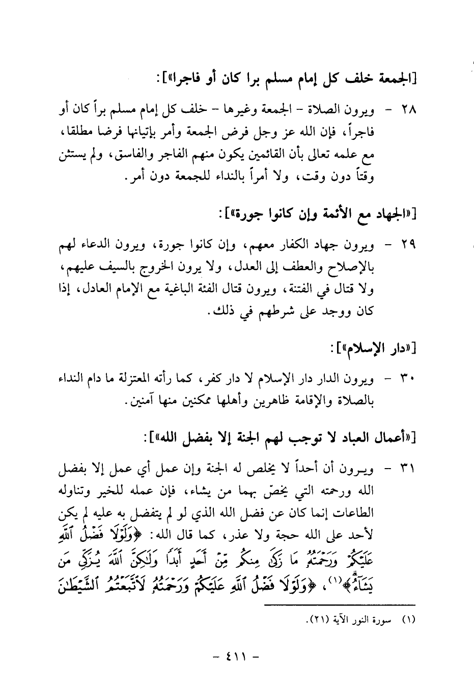 30- ويرون الدار دار الإسلام لا دار كفر، كما رأته المعتزلة ما دام النداء بالصلاة والإقامة ظاهرين وأهلها ممكنين منها آمنين.