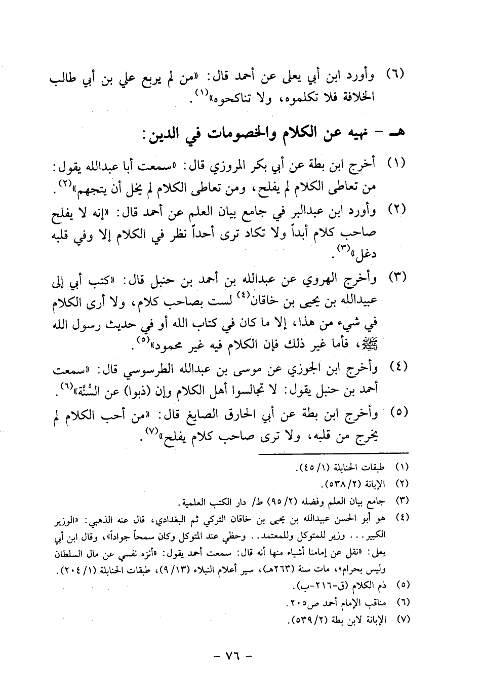 (1) أخرج ابن بطة عن أبي بكر المروزي قال: "سمعت أبا عبد الله يقول: من تعاطى الكلام لم يفلح، ومن تعاطى الكلام لم يخل أن يتجهم"2.