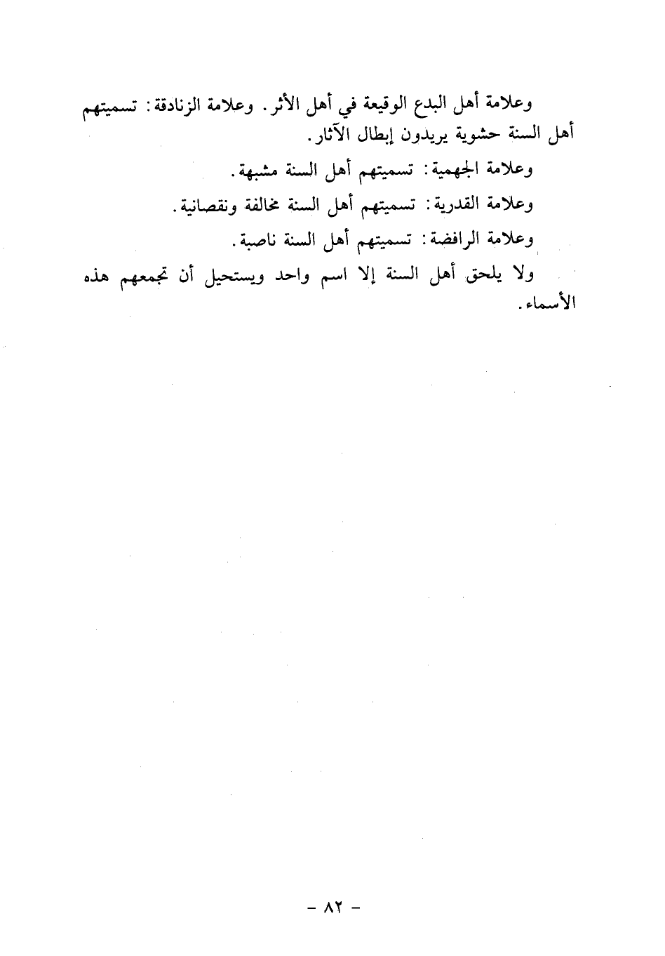 وعلامة القدرية: تسميتهم أهل السنة مخالفة ونقصانية.