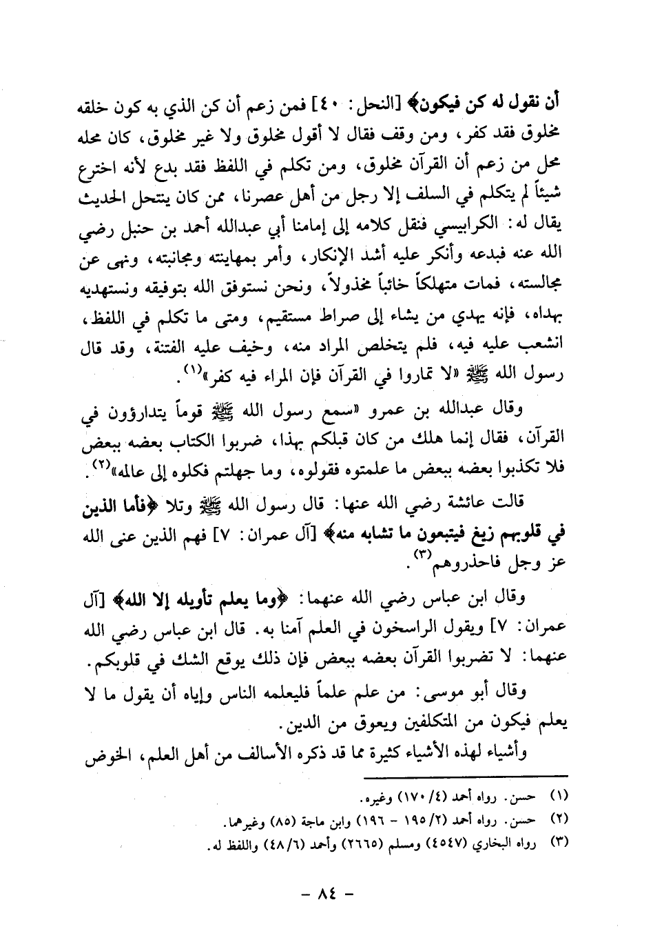 وقال عبد الله بن عمرو "سمع رسول الله صلى الله عليه وسلم قوماً يتدارؤون في القرآن، فقال إنما هلك من كان قبلكم بهذا، ضربوا الكتاب بعضه ببعض فلا تكذبوا بعضه ببعض ما علمتوه فقولوه، وما جهلتم فكلوه إلى عالمه"2. قالت عائشة رضي الله عنها: قال رسول الله صلى الله عليه وسلم وتلا {فأما الذين في قلوبهم زيغ فيتبعون ما تشابه منه} [آل عمران: 7] فهم الذين عنى الله عز وجل فاحذروهم3.