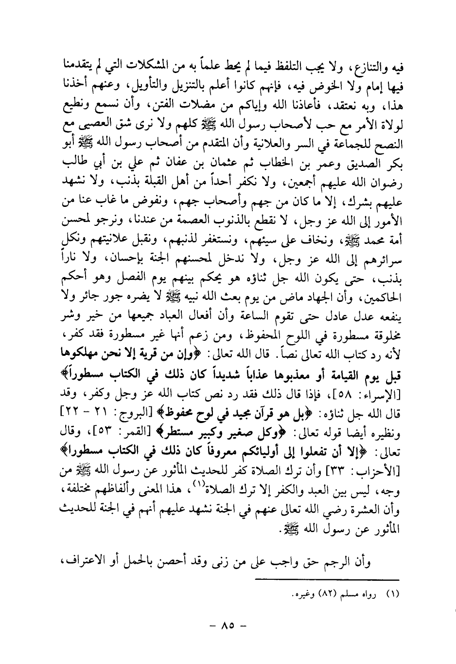 فيه والتنازع، ولا يجب التلفظ فيما لم يحط علماً به من المشكلات التي لم يتقدمنا فيها إمام ولا الخوض فيه، فإنهم كانوا أعلم بالتنزيل والتأويل، وعنهم أخذنا هذا، وبه نعتقد، فأعاذنا الله وإياكم من مضلات الفتن، وأن نسمع ونطيع لولاة الأمر مع حب لأصحاب رسول الله صلى الله عليه وسلم كلهم ولا نرى شق العصيى مع النصح للجماعة في السر والعلانية وأن المتقدم من أصحاب رسول الله صلى الله عليه وسلم أبو بكر الصديق وعمر بن الخطاب ثم عثمان بن عفان ثم علي بن أبي طالب رضوان الله عليهم أجمعين، ولا نكفر أحداً من أهل القبلة بذنب، ولا نشهد عليهم بشرك، إلا ما كان من جهم وأصحاب جهم، ونفوض ما غاب عنا من الأمور إلى الله عز وجل، لا نقطع بالذنوب العصمة من عندنا، ونرجو لمحسن أمة محمد صلى الله عليه وسلم، ونخاف على سيئهم، ونستغفر لذنبهم، ونقبل علانيتهم ونكل سرائرهم إلى الله عز وجل، ولا ندخل لمحسنهم الجنة بإحسان، ولا ناراً بذنب، حتى يكون الله جل ثناؤه هو يحكم بينهم يوم الفصل وهو أحكم الحاكمين، وأن الجهاد ماض من يوم بعث الله نبيه صلى الله عليه وسلم لا يضره جور جائر ولا ينفعه عدل عادل حتى تقوم الساعة وأن أفعال العباد جميعها من خير وشر مخلوقة مسطورة في اللوح المحفوظ، ومن زعم أنها غير مسطورة فقد كفر، لأنه رد كتاب الله تعالى نصاً. قال الله تعالى: {وإن من قرية إلا نحن مهلكوها قبل يوم القيامة أو معذبوها عذاباً شديداً كان ذلك في الكتاب مسطورا} [الإسراء: 58] ، فإذا قال ذلك فقد رد نص كتاب الله عز وجل وكفر، وقد قال الله جل ثناؤه: {بل هو قرآن مجيد في لوح محفوظ} [البروج: 21- 22] ونظيره أيضاً قوله تعالى: {وكل صغير وكبير مستطر} [القمر: 53] ، وقال تعالى: {إلا أن تفعلوا إلى أوليائكم معروفاً كان ذلك في الكتاب مسطورا} [الأحزاب: 33] وأن ترك الصلاة كفر للحديث المأثور عن رسول الله صلى الله عليه وسلم من وجه، ليس بين العبد والكفر إلا ترك الصلاة1، هذا المعنى وألفاظهم مختلفة، وأن العشرة رضي الله تعالى عنهم في الجنة نشهد عليهم أنهم في الجنة للحديث المأثور عن رسول الله صلى الله عليه وسلم.