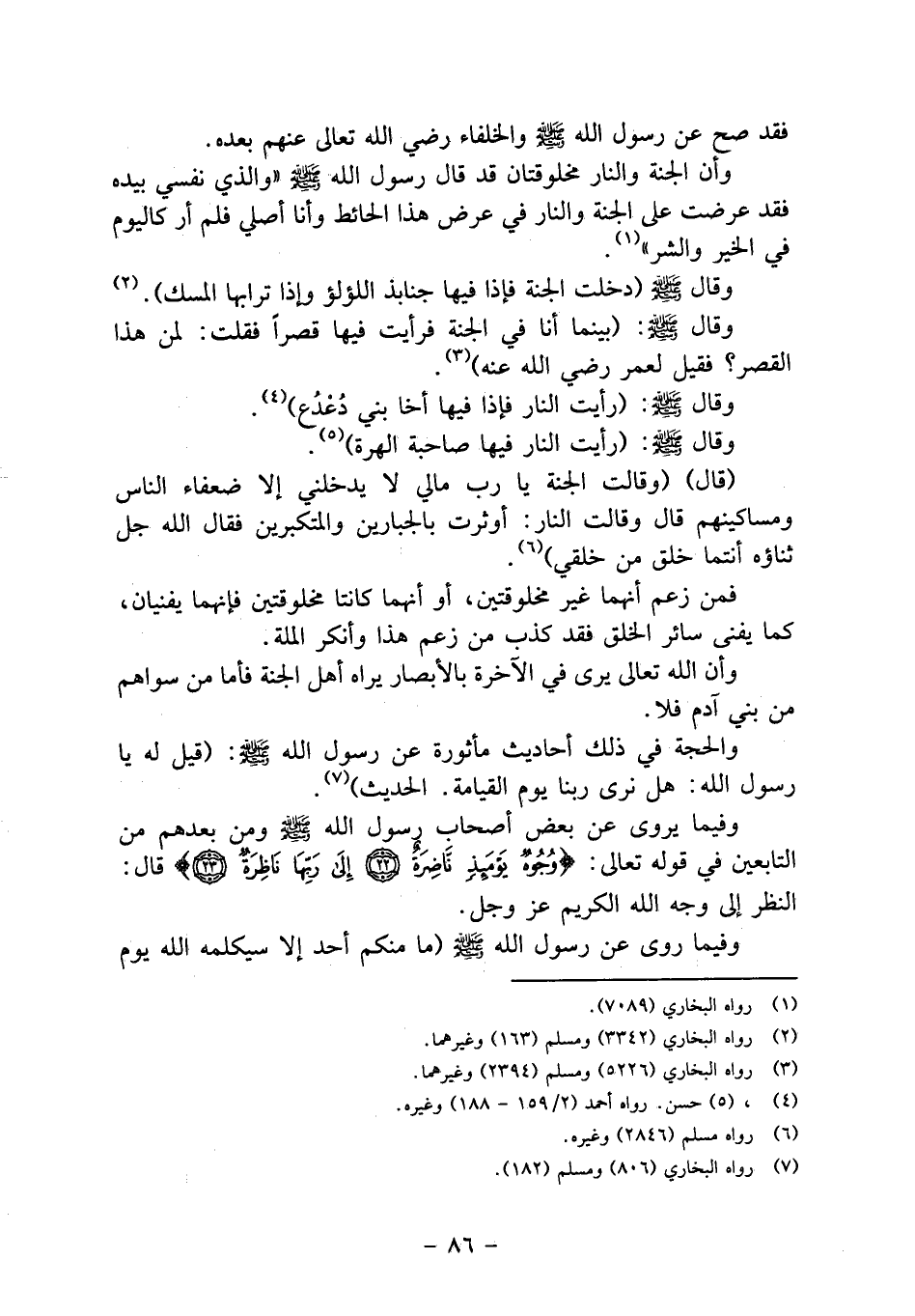 وأن الجنة والنار مخلوقتان قد قال رسول الله صلى الله عليه وسلم: "والذي نفسي بيده فقد عرضت على الجنة والنار في عرض هذا الحائط وأنا أصلي فلم أر كاليوم في الخير والشر"1.