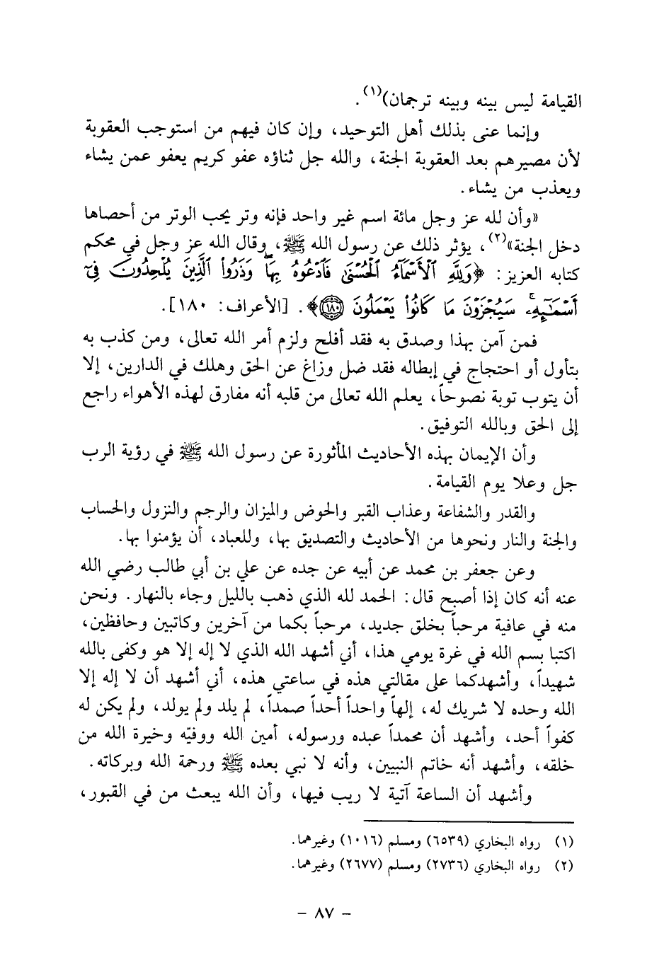 والقدر والشفاعة وعذاب القبر والحوض والميزان والرجم والنزول والحساب والجنة والنار ونحوها من الأحاديث والتصديق بها، وللعباد، أن يؤمنوا بها.