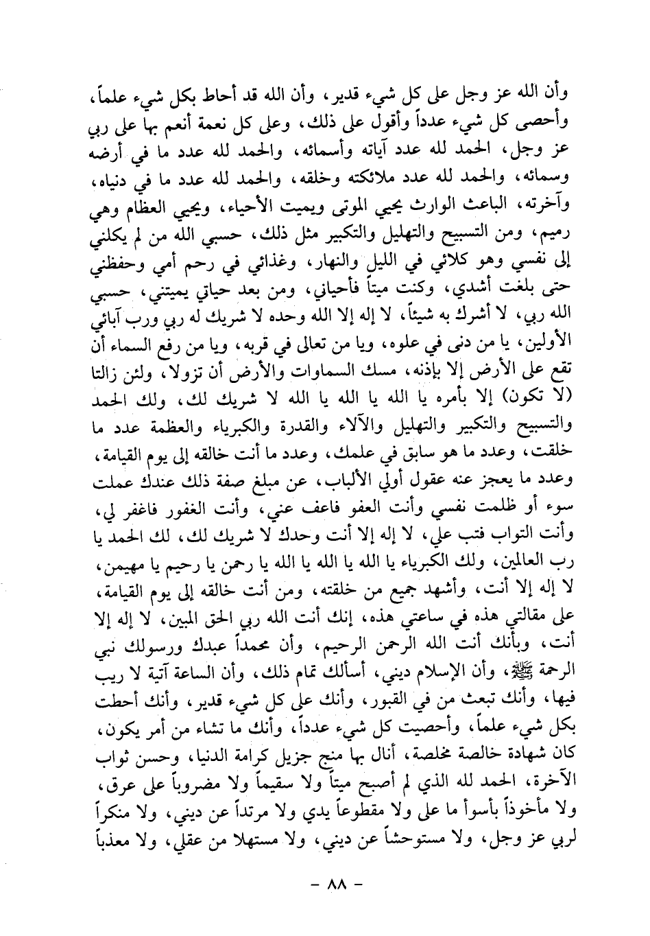 وأن الله عز وجل على كل شيء قدير، وأن الله قد أحاط بكل شيء علماً، وأحصى كل شيء عدداً وأقول على ذلك، وعلى كل نعمة أنعم بها على ربي عز وجل، الحمد لله عدد آياته وأسمائه، والحمد لله عدد ما في أرضه وسمائه، والحمد لله عدد ملائكته وخلقه، والحمد لله عدد ما في دنياه، وآخرته، الباعث الوارث يحيي الموتى ويميت الأحياء، ويحيي العظام وهي رميم، ومن التسبيح والتهليل والتكبير مثل ذلك، حسبي الله من لم يكلني إلى نفسي وهو كلائي في الليل والنهار، وغذائي في رحم أمي وحفظني حتى بلغت أشدي، وكنت ميتاً فأحياني، ومن بعد حياتي يميتني، حسبي الله ربي، لا أشرك به شيئاً، لا إله إلا الله وحده لا شريك له رب ورب أبائي الأولين، يا من دنى في علوه، ويا من تعالى في قربه، ويا من رفع السماء أن تقع على الأرض إلا بإذنه، مسك السماوات والأرض أن تزولا، ولئن زالتا (لا تكون) إلا بأمره يا الله يا الله يا الله لا شريك لك، ولك الحمد والتسبيح والتكبير والتهليل والآلاء والقدرة والكبرياء والعظمة عدد ما خلقت، وعدد ما هو سابق في علمك، وعدد ما أنت خالقه إلى يوم القيامة، وعدد ما يعجز عنه عقول أولي الألباب، عن مبلغ صفة ذلك عندك عملت سوء أو ظلمت نفسي وأنت العفو فاعف عني، وأنت الغفور فاغفر لي، وأنت التواب فتب علي، لا إله إلا أنت وحدك لا شريك لك، لك الحمد يا رب العالمين، ولك الكبرياء يا الله يا الله يا الله يا رحمن يا رحيم يا مهيمن، لا إله إلا أنت، وأشهد جميع من خلقته، ومن أنت خالقه إلى يوم القيامة، على مقالتي هذه في ساعتي هذه، إنك أنت الله رب الحق المبين، لا إله إلا أنت، وبأنك أنت الله الرحمن الرحيم، وأن محمداً عبدك ورسولك نبي الرحمة صلى الله عليه وسلم، وأن الإسلام ديني، أسألك تمام ذلك، وأن الساعة آتية لا ريب فيها، وأنك تبعث من في القبور، وأنك على كل شيء قدير، وأنك أحطت بكل شيء علماً، وأحصيت كل شيء عدداً، وأنك ما تشاء من أمر يكون، كان شهادة خالصة مخلصة، أنال بها منج جزيل كرامة الدنيا، وحسن ثواب الآخرة، الحمد لله الذي لم أصبح ميتاً ولا سقيماً ولا مضروباً على عرق، ولا مأخوذاً بأسوأ ما على ولا مقطوعاً يدي ولا مرتداً عن ديني، ولا منكراً لربي عز وجل، ولا مستوحشاً عن ديني، ولا مستهلاً من عقلي، ولا معذباً