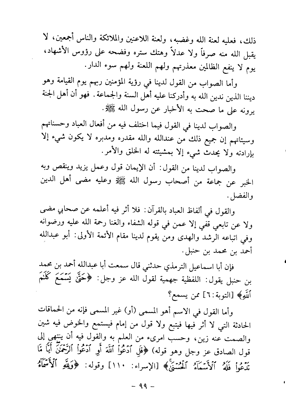 والقول في ألفاظ العباد بالقرآن: فلا أثر فيه أعلمه عن صحابي مضى ولا عن تابعي قفي إلا عمن في قوله الشفاء والغنا رحمة الله عليه ورضوانه وفي إتباعه الرشد والهدى ومن يقوم لدينا مقام الأئمة الأولى: أبو عبد الله أحمد بن محمد بن حنبل.