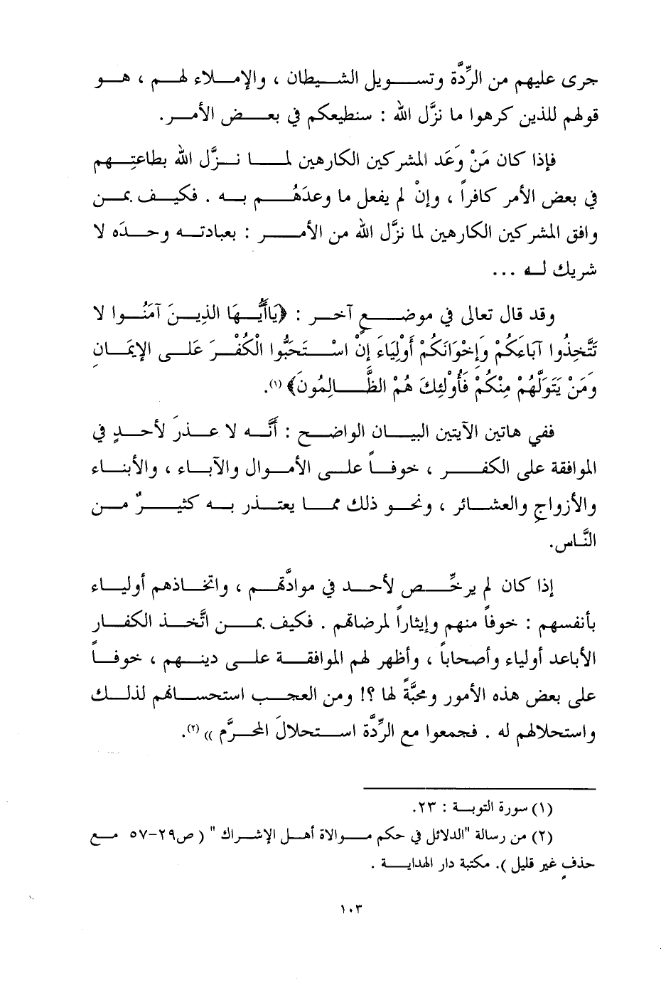 (¬2) من رسالة "الدلائل في حكم موالاة أهل الإشراك " (ص29-57 مع حذفٍ غير قليل) . مكتبة دار الهداية.