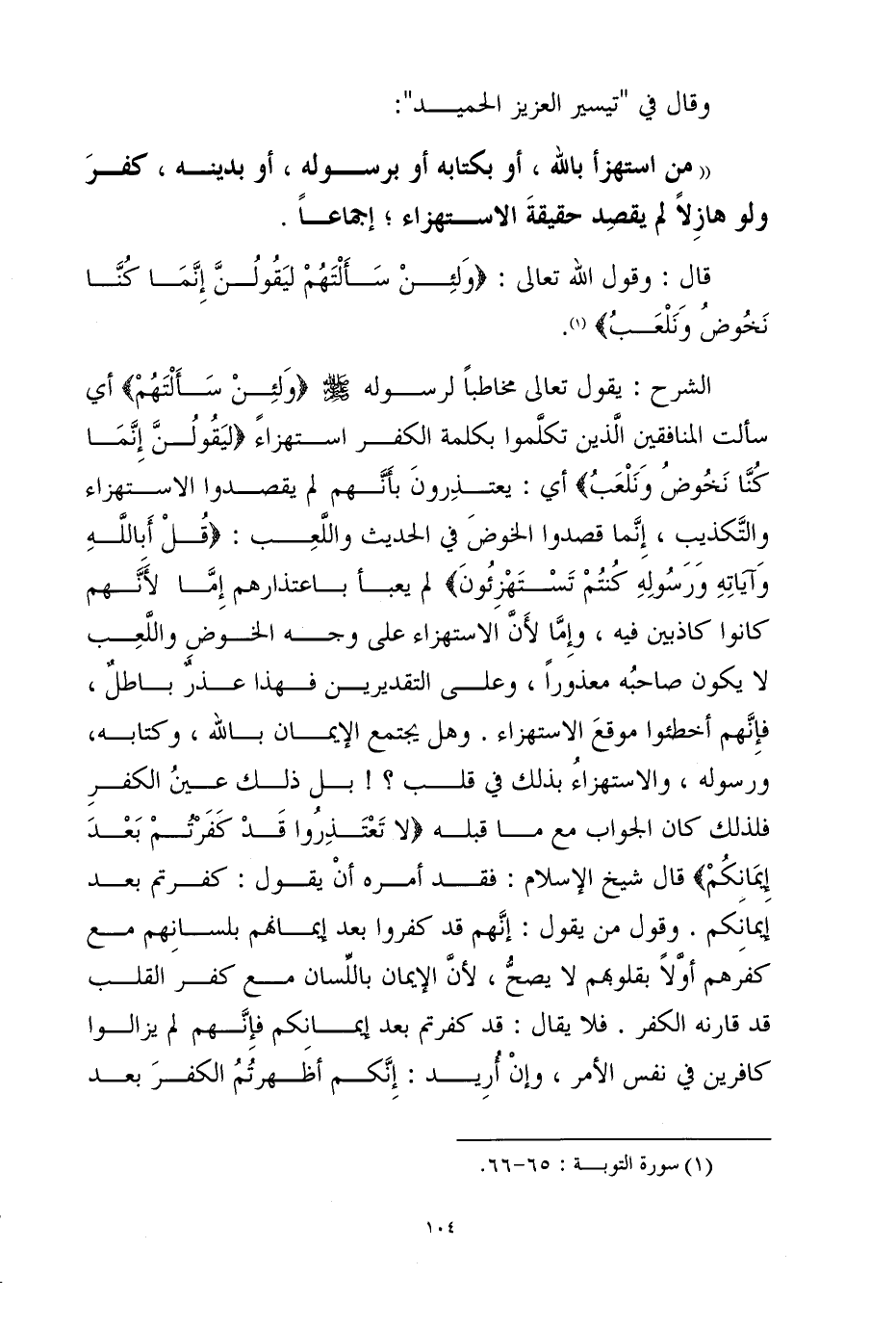 الشرح: يقول تعالى مخاطباً لرسوله {? وَلئِنْ سَأَلْتَهُمْ} أي سألت المنافقين الَّذين تكلَّموا بكلمة الكفر استهزاءً {ليَقُولُنَّ إِنَّمَا كُنَّا نَخُوضُ وَنَلْعَبُ} أي: يعتذِرونَ بأَنَّهم لم يقصدوا الاستهزاء والتَّكذيب، إِنَّما قصدوا الخوضَ في الحديث واللَّعِب: {قُلْ أَبِاللَّهِ وَآيَاتِهِ وَرَسُولِهِ كُنتُمْ تَسْتَهْزِئُونَ} لم يعبأ باعتذارهم إِمَّا لأَنَّهم كانوا كاذبين فيه، وإِمَّا لأَنَّ الاستهزاء على وجه الخوضِ واللَّعِب لا يكون صاحبُه معذوراً، وعلى التقديرين فهذا عذرٌ باطلٌ، فإِنَّهم أخطئوا موقعَ الاستهزاء. وهل يجتمع الإيمان بالله، وكتابه، ورسوله، والاستهزاءُ بذلك في قلب؟ ! بل ذلك عينُ الكفرِ فلذلك كان الجواب مع ما قبله {لا تَعْتَذِرُوا قَدْ كَفَرْتُمْ بَعْدَ إِيمَانِكُمْ} قال شيخ الإسلام: فقد أمره أنْ يقول: كفرتم بعد إيمانِكم. وقول من يقول: إنَّهم قد كفروا بعد إيمانهم بلسانِهم مع كفرهم أوَّلاً بقلوبهم لا يصحُّ، لأنَّ الإيمان باللِّسان مع كفر القلب قد قارنه الكفر. فلا يقال: قد كفرتم بعد إيمانِكم فإِنَّهم لم يزالوا كافرين في نفس الأمر، وإنْ أُرِيد: إِنَّكم أظهرتُمُ الكفرَ بعد