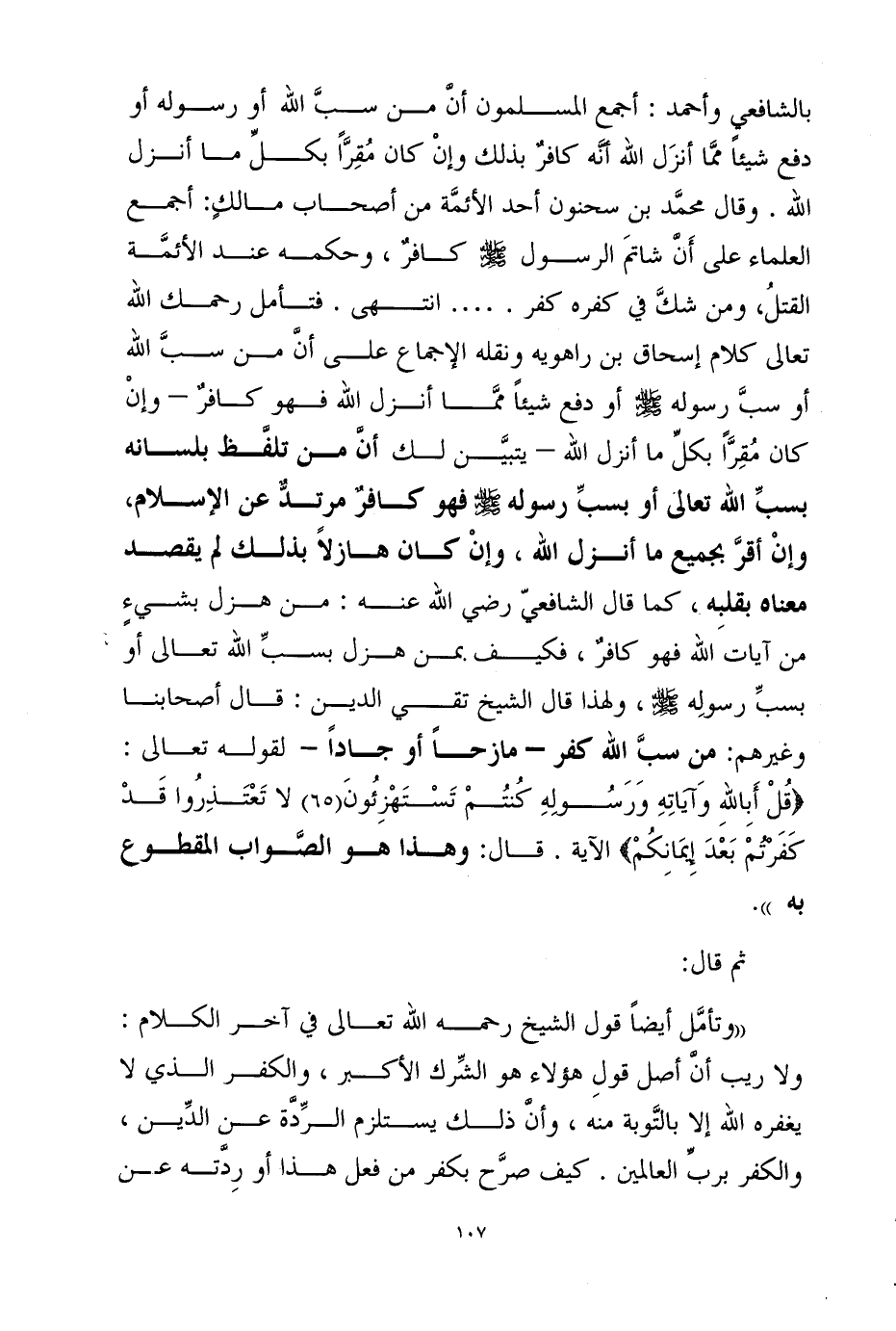 بالشافعي وأحمد: أجمع المسلمون أنَّ من سبَّ الله أو رسوله أو دفع شيئاً ممَّا أنزَل الله أنَّه كافرٌ بذلك وإنْ كان مُقِرَّاً بكلِّ ما أنزل الله. وقال محمَّد بن سحنون أحد الأئمَّة من أصحاب مالكٍ: أجمع العلماء على أَنَّ شاتمَ الرسول ? كافرٌ، وحكمه عند الأئمَّة القتلُ، ومن شكَّ في كفره كفر. ... . انتهى. فتأمل رحمك الله تعالى كلام إسحاق بن راهويه ونقله الإجماع على أنَّ من سبَّ الله أو سبَّ رسوله ?أو دفع شيئاً ممَّا أنزل الله فهو كافرٌ - وإنْ كان مُقِرَّاً بكلِّ ما أنزل الله - يتبيَّن لك أنَّ من تلفَّظ بلسانه بسبِّ الله تعالى أو بسبِّ رسوله ? فهو كافرٌ مرتدٌّ عن الإسلام، وإنْ أقرَّ بجميع ما أنزل الله، وإنْ كان هازلاً بذلك لم يقصد معناه بقلبِه، كما قال الشافعيّ رضي الله عنه: من هزل بشيءٍ من آيات الله فهو كافرٌ، فكيف بمن هزل بسبِّ الله تعالى أو بسبِّ رسولِه ?، ولهذا قال الشيخ تقي الدين: قال أصحابنا وغيرهم: من سبَّ الله كفر - مازحاً أو جاداً - لقوله تعالى: {قُلْ أَبِاللهِ وَآيَاتِهِ وَرَسُولِهِ كُنتُمْ تَسْتَهْزِئُونَ (65) لا تَعْتَذِرُوا قَدْ كَفَرْتُمْ بَعْدَ إِيمَانِكُمْ} الآية. قال: وهذا هو الصَّواب المقطوع به)) .