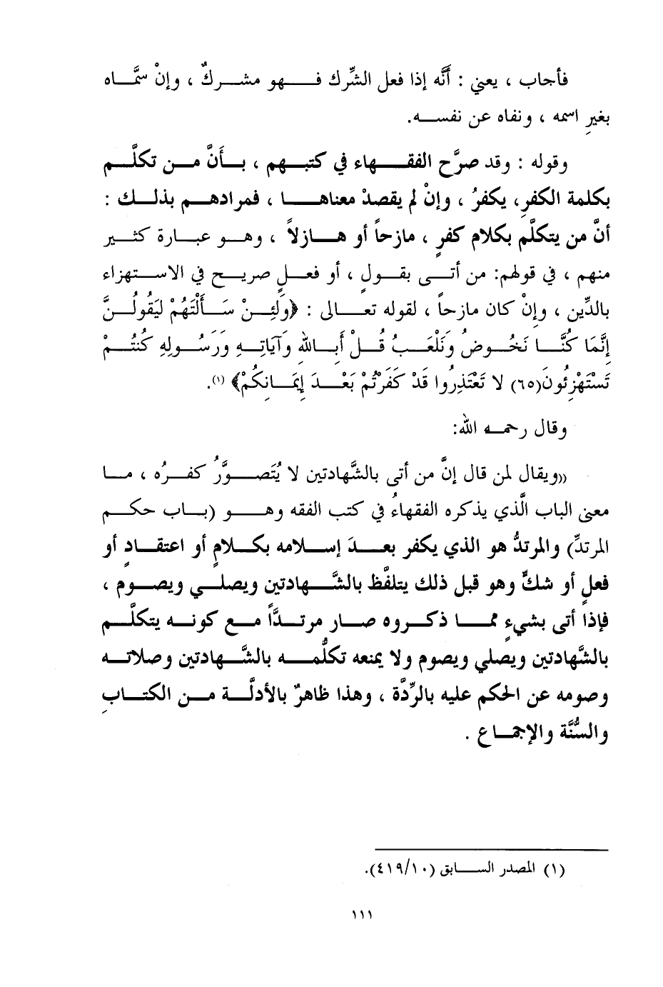 ((ويقال لمن قال إنَّ من أتى بالشَّهادتين لا يُتَصوَّرُ كفرُه، ما معنى الباب الَّذي يذكره الفقهاءُ في كتب الفقه وهو (باب حكم المرتدِّ) والمرتدُّ هو الذي يكفر بعدَ إسلامه بكلامٍ أو اعتقادٍ أو فعلٍ أو شكٍّ وهو قبل ذلك يتلفَّظ بالشَّهادتين ويصلي ويصوم، فإذا أتى بشيءٍ مما ذكروه صار مرتدَّاً مع كونه يتكلَّم بالشَّهادتين ويصلي ويصوم ولا يمنعه تكلُّمه بالشَّهادتين وصلاته وصومه عن الحكم عليه بالرِّدَّة، وهذا ظاهرٌ بالأدلَّة من الكتابِ والسُّنَّة والإجماع.