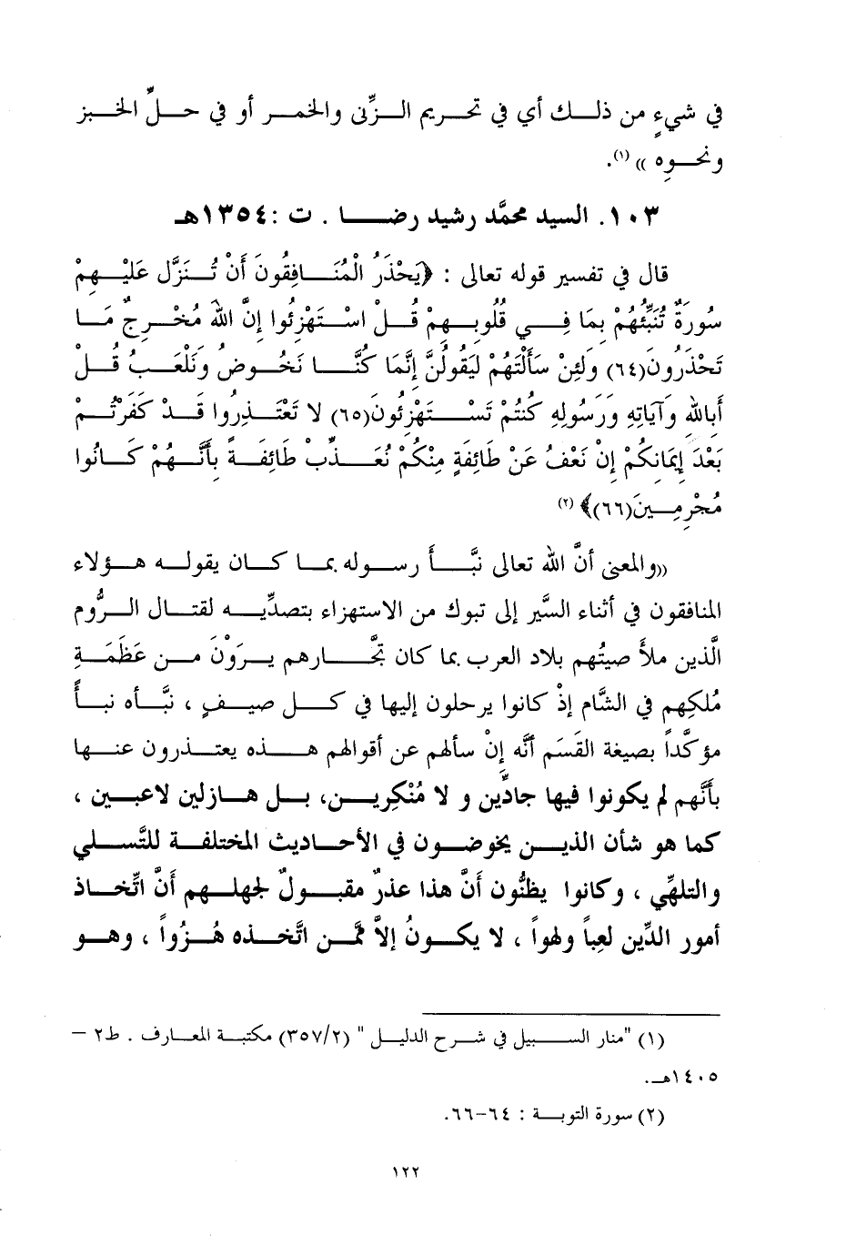 قال في تفسير قوله تعالى: {يَحْذَرُ الْمُنَافِقُونَ أَنْ تُنَزَّل عَليْهِمْ سُورَةٌ تُنَبِّئُهُمْ بِمَا فِي قُلُوبِهِمْ قُلْ اسْتَهْزِئُوا إِنَّ اللهَ مُخْرِجٌ مَا تَحْذَرُونَ (64) وَلئِنْ سَأَلْتَهُمْ ليَقُولُنَّ إِنَّمَا كُنَّا نَخُوضُ وَنَلْعَبُ قُلْ أَبِاللهِ وَآيَاتِهِ وَرَسُولِهِ كُنتُمْ تَسْتَهْزِئُونَ (65) لا تَعْتَذِرُوا قَدْ كَفَرْتُمْ بَعْدَ إِيمَانِكُمْ إِنْ نَعْفُ عَنْ طَائِفَةٍ مِنْكُمْ نُعَذِّبْ طَائِفَةً بِأَنَّهُمْ كَانُوا مُجْرِمِينَ (66) } (¬2)
