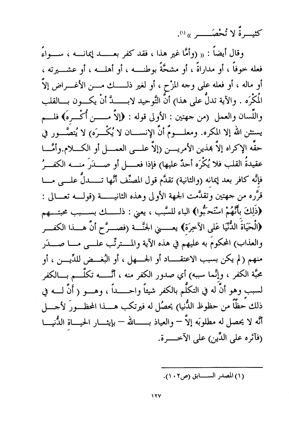وقال أيضاً: (( (وأمَّا غير هذا، فقد كفر بعد إيمانه، سواءً فعله خوفاً، أو مداراةً، أو مشحَّةً بوطنه، أو أهله، أو عشيرته، أو ماله، أو فعله على وجه المزْحِ، أو لغير ذلك من الأغراض إلاَّ المُكْرَه. والآية تدلُّ على هذا) أنَّ التَّوحيد لابدَّ أنْ يكون بالقلب واللِّسان والعمل (من جهتين: الأولى قوله: {إلاَّ من أُكْرِهَ} فلم يستثن الله إلا المكره. ومعلومٌ أنَّ الإنسان لا يُكْرَه) لا يُتصَّور في حقِّه الإكراه إلاَّ بهذين الأمرين (إلاَّ على العمل أو الكلام. وأمَّا عقيدةُ القلب فلا يُكْرَه أحدٌ عليها) فإذا فعل أو صدَرَ منه الكفرُ فإِنَّه كافر بعد إيمانِه (والثانية) تقدَّم قول المصنِّف أنَّها تدلُّ على ما قرَّره من جهتين وتقدَّمت الجهة الأولى وهذه الثانية (قوله تعالى: {ذَلِكَ بِأَنَّهُمْ اسْتَحَبُّوا} الباء للسَّبب، يعني: ذلك بسبب محبتهم {الْحَيَاةَ الدُّنْيَا عَلى الآخِرَةِ} يعني الجنَّة (فصرَّح أنَّ هذا الكفر والعذاب) المحكومَ به عليهم في هذه الآية والمترتِّب على ما صدَر منهم (لم يكن بسبب الاعتقاد أو الجهل، أو البُغض للدِّين، أو محبَّة الكفر، وإِنَّما سببه) أي صدور الكفر منه، أنَّه تكلَّم بالكفر لسببٍ وهو أنَّ له في التكلُّم بالكفر شيئاً واحداً، وهو (أَنَّ له في ذلك حظَّاً من حظوظ الدُّنيا) يحصُل له فيرتكب هذا المحظورَ لأجل أنَّه لا يحصل له مطلوبَه إلاَّ - والعياذ بالله - بإيثار الحياةِ الدُّنيا (فآثره على الدِّين) على الآخرة.