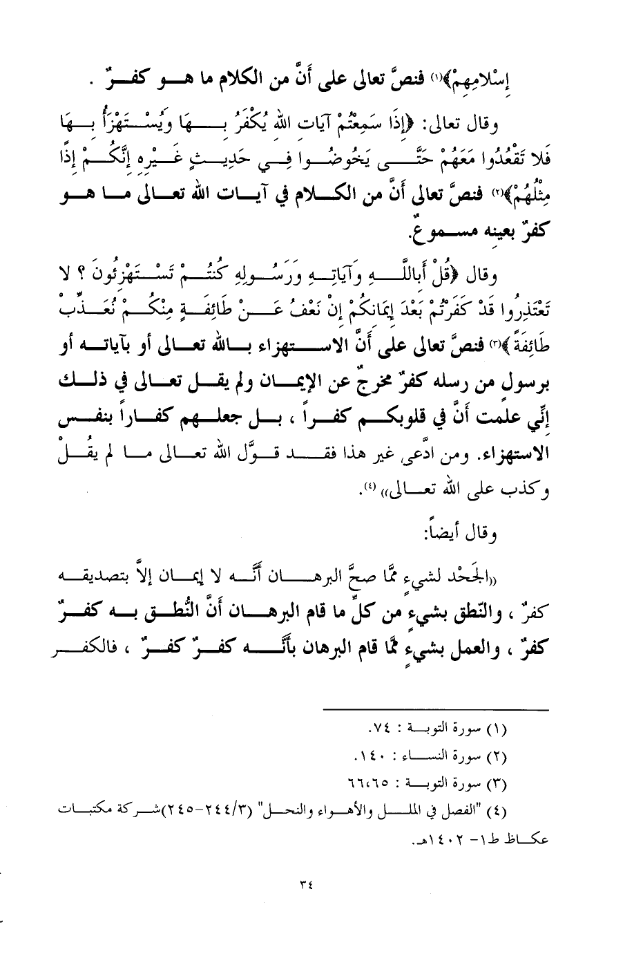 ... ((الجَحْد لشيءٍ ممَّا صحَّ البرهان أَنَّه لا إيمان إلاَّ بتصديقه كفرٌ، والنّطق بشيءٍ من كلِّ ما قام البرهان أَنَّ النُّطق به كفرٌ كفرٌ، والعمل بشيءٍ ممَّا قام البرهان بأَنَّه كفرٌ كفرٌ، فالكفر