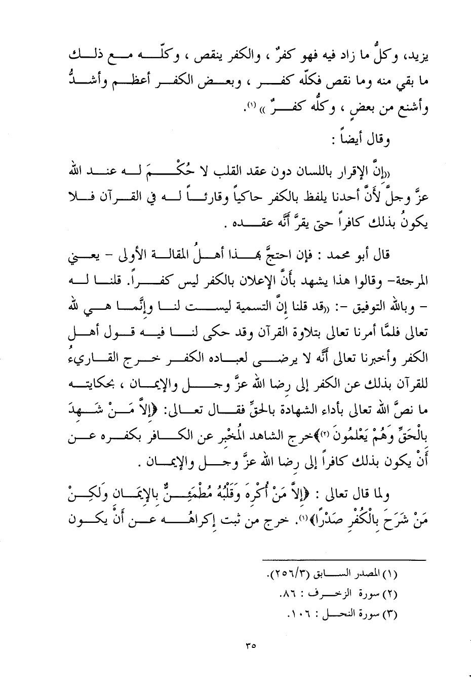 ... ((إِنَّ الإقرار باللسان دون عقد القلب لا حُكْمَ له عند الله عزَّ وجلَّ لأَنَّ أحدنا يلفظ بالكفر حاكياً وقارئاً له في القرآن فلا يكونُ بذلك كافراً حتى يقرَّ أَنَّه عقده.